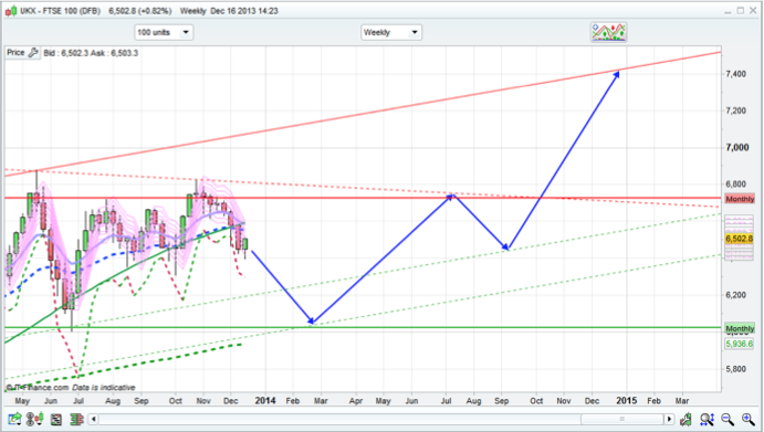 I won’t try and hazard a guess any geo political occurrences that might happen as that really is just guessing however that channel on the weekly chart does look favourable for further rises and a possibly fairly optimistic and upbeat 2014 (in the end!) closing around 7350.