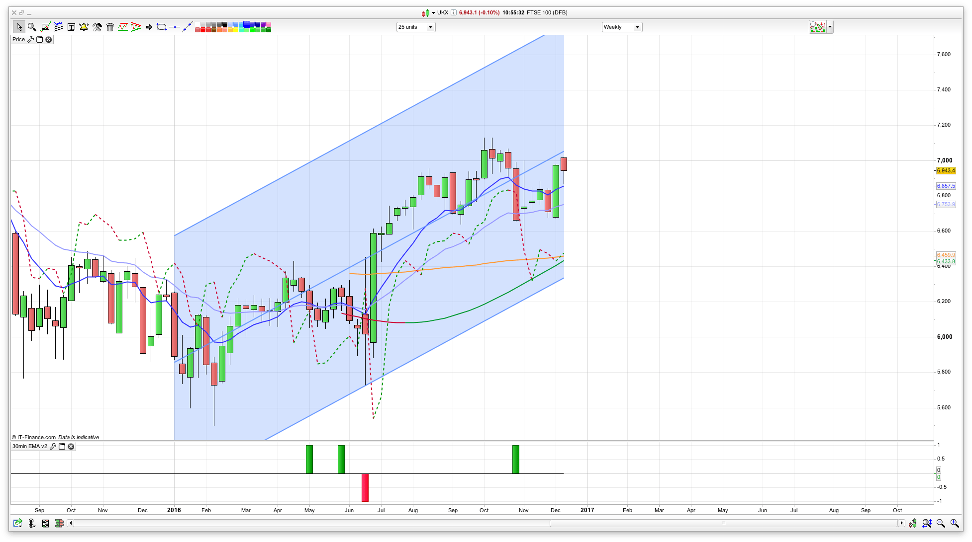 I can see a fairly bearish start to the year off the back of a strong close in 2016. The US markets have been pushing to new highs, though the FTSE has lagged considerably, since testing 7130 during October 2016. As you can see from the weekly chart below, the overall trend has been a bullish one, rising to where we are closing out the year.