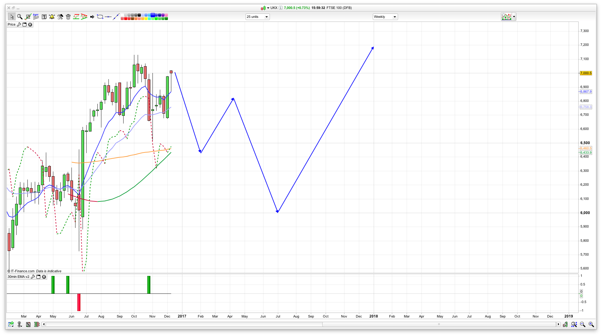 I can see a dip in Q1 and possibly Q2 down to the 6500 level where we have the 200ema on the weekly chart, before a climb back from there. I also have one of my custom signals showing weekly support around this area – the green line on the chart.