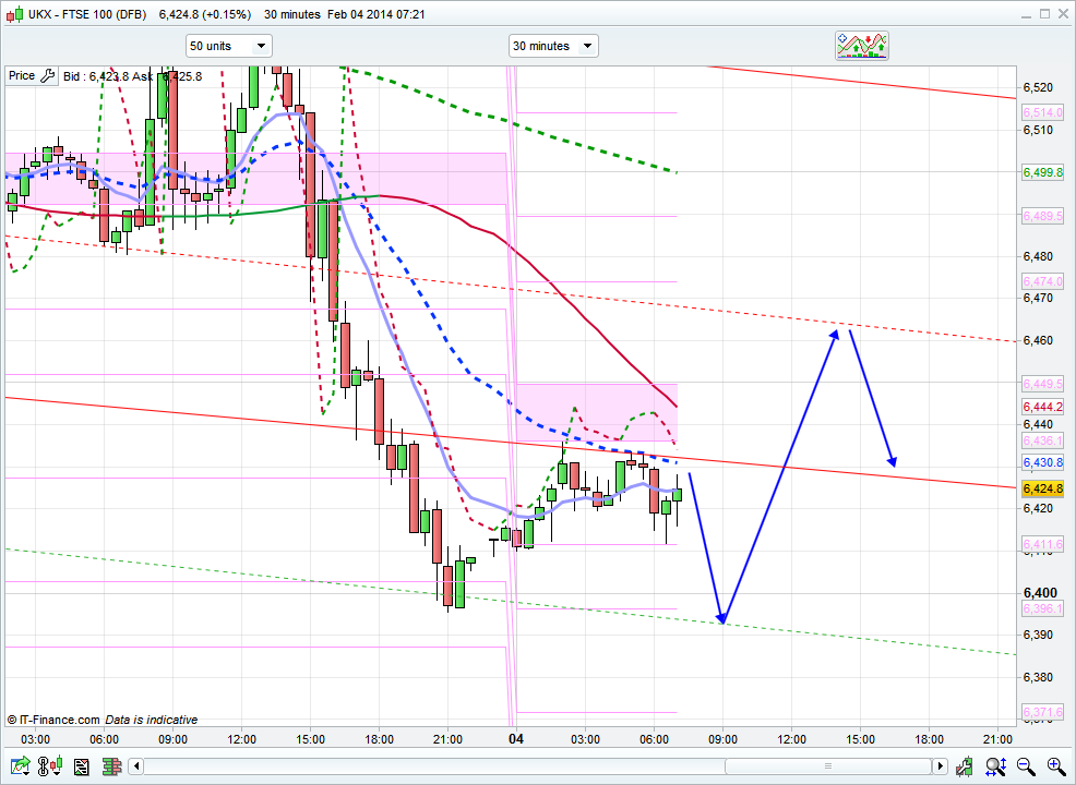 Today’s pivot is 6488 so likely to be resistance if seen, an area that tallies with the 200ema on the 30 minute chart. On the 30 minute chart we have a few ProTrend lines in play and I have plotted what I think will happen.