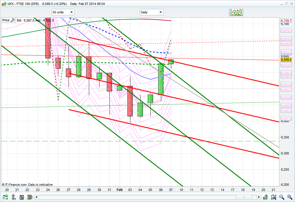 The FTSE is just above the 20 day Raff channel and testing the 10 day as I write. Therefore I’d say that an initial dip from this 6590 area is likely initially, maybe as far down as support at the daily pivot at 6514, though that’s quite a drop I admit. Upside targets while prices remain above 6567 are 6653 and 6730. Lower support is at 6490 then 6432. I wouldn’t be looking to load up large long positions while the price is at the top of the daily channels, though as mentioned above with NFP its going to get spikey anyway.