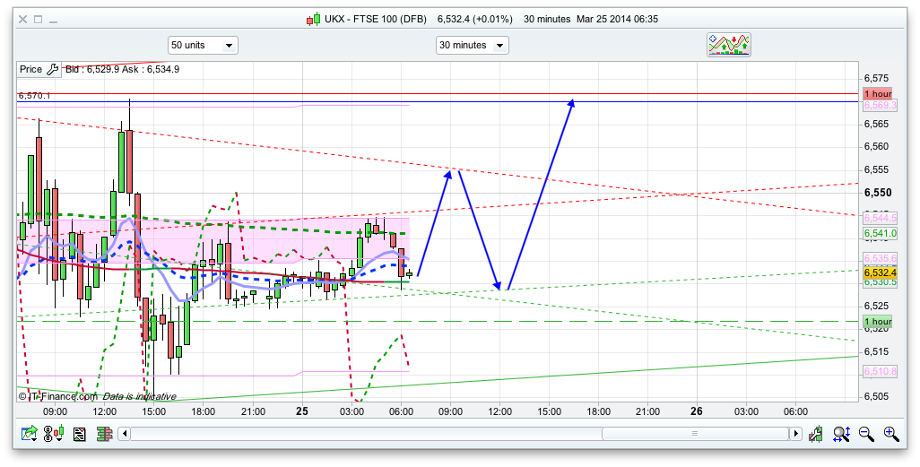 Good morning. To sum up yesterday, so close but yet so far. I had top resistance at 6573 and the high was 6571.9, I had bottom support at 6503 and the low was 6504.1. Therefore the order levels I quoted were a bit too exact but I gather from various emails that a few of you shorted at 70 and longed at 05 so all well done for that! The new chat room is bedding in OK – yes its a bit different but at least this one allows me to share my charts. Im still shopping around anyway and there is a new one that launches in a few weeks that looks promising with more functionality, so I may well switch again soon.