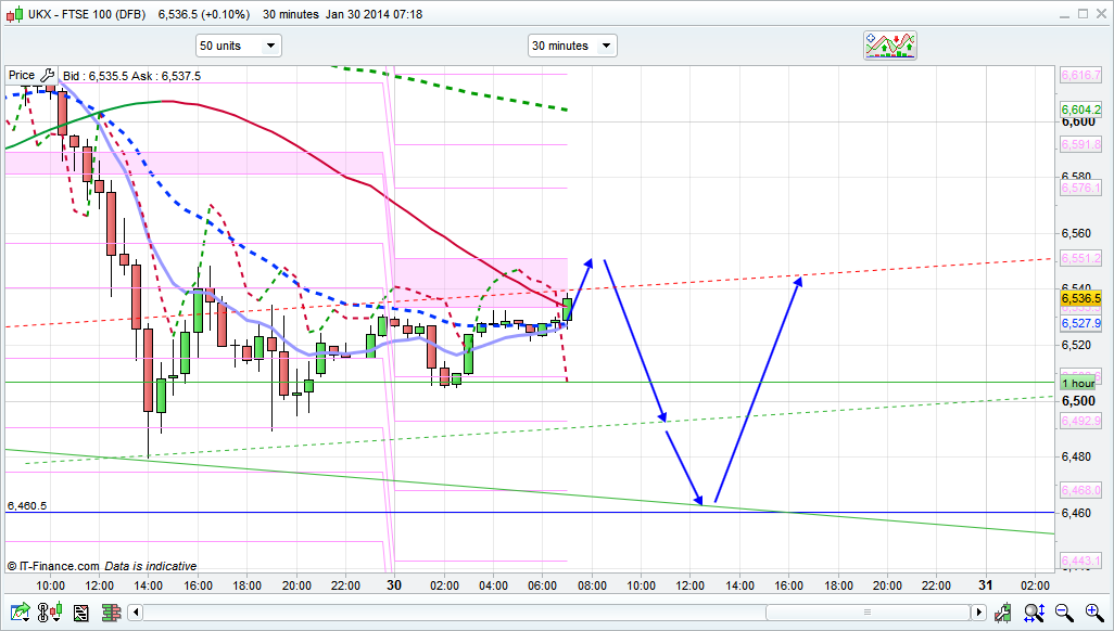 Good morning. What a day yesterday, when the price hit the 6642 area I mentioned and thought it was a short it all looked pretty risky after a strong climb at the open. Oh what a false prophecy that was! My 6615 short first thing got stopped (which was fortunately quite tight so minimal damage) but was just a bit early shorting there. We then had some serious drops getting as low as 6488 out of hours yesterday. It all felt quite risky placing the trades at the time but that short and the later long paid off, just a bit gutting I closed the short when I did! C’est la vie! Of course most of the movement yesterday was down to the Fed as I am sure you know, who have cut QE by a further $10 billion per month. no real surprises there, and one could argue that by tapering they have faith in the recovery and economic strength. It has sent emerging markets into a tailspin though!