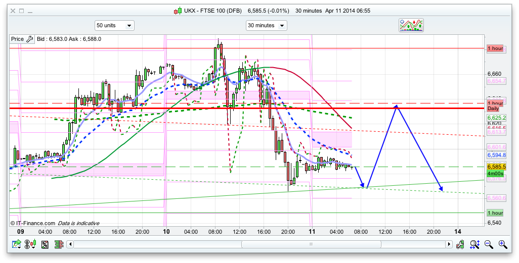 There is a rising 30 minute trend line with support at 6570 so if there was an initial drop that could well be support so I would look to go long there but probably try a half stakes long at 6581 (Bianca channel) first, to target 6620, 6640. Then going into the weekend i think a dip again. I don’t think that 6650 pivot will be broken today so a short there would be worth a go as well.