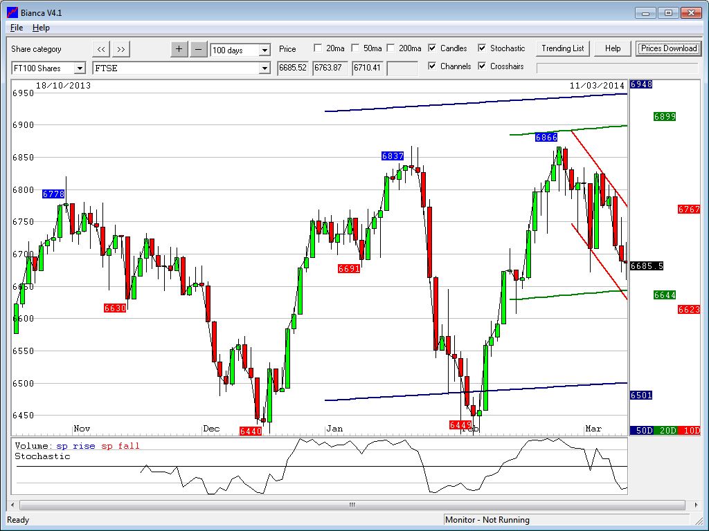 Good morning. Naughty spike up first thing yesterday before the dip , which exceeded the 6706 pivot but didn’t quite reach the 6721 shorting area, however during the course of the day we got the decline to 6645 at around 7pm. The gold trade worked out better yesterday with the short off 1352 closing at 1340, good job too as its climbed strongly since as a flight to safety takes place. The FTSE still looks weak for the moment and is most likely going to test the bottom of the Bianca 10 day at 6623. Maybe even 6550 soon (bottom of the Raffs)!