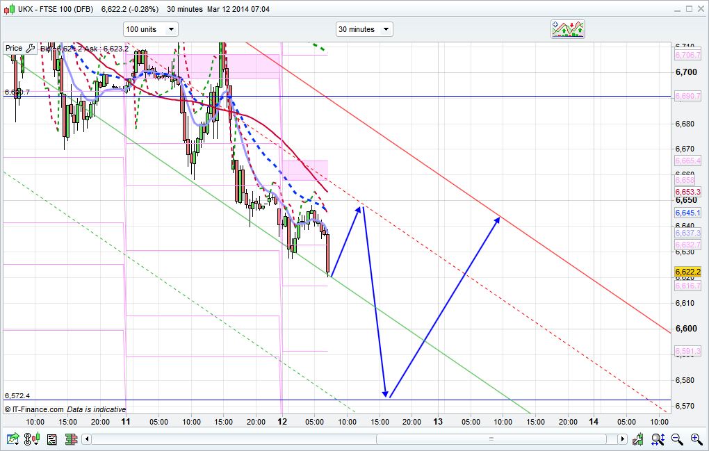 Frankly, the FTSE looks weak for the moment, with a downtrending channel on the 30 minute and a break through the 6645 support mentioned yesterday. With gold rising strongly and breaking that 1352 there is a definite flight to safety going on, as well as hardly any divi hunters coming out last night, despite a large 20 point divi.