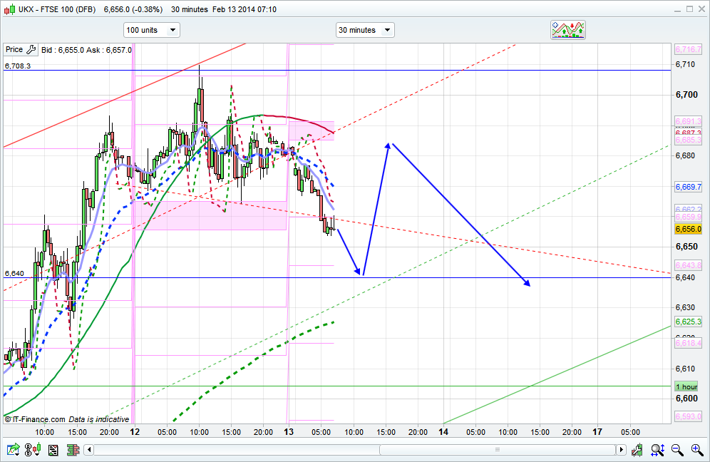 Good morning, the gamble for the short at 6708 paid off yesterday in the end though it looked like a very risky one at the time – every man and his dog was/is bullish and we had a decent climb getting to that level. As it turns out its looking like that might be it, especially as we haven’t had the retest and overnight has been pretty weak. We are now around 6653 as I write this. I mentioned earlier this week that I was a expecting a bearish end to the week, most likely on Friday 14th, I still think that’s the case though maybe it will start today? Asia has just ended a 6 day bull run.