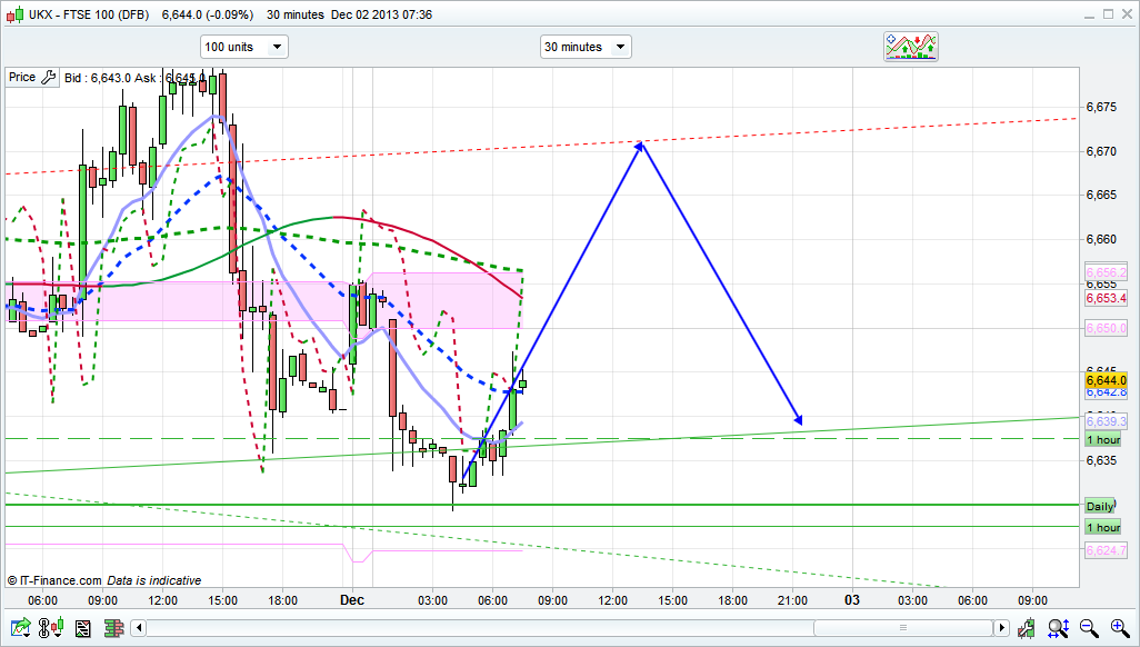 Well Friday played out very well in the end, despite me closing that short a bit early we got the drop form the 6680 area as expected. Was one of those days where it was slow to rise but quick to drop following the USA. There is a bit of initial support at this 6640 area, where Fridays final down arrow terminated, and based on the ProRealTime lines we have a daily support there, and I expect an initial rise to 6670. That’s a fairly key resistance level as its also around the top of the 10 day Bianca channel, and also tallies with my Dax thoughts above for a rise then dip from 9420ish.