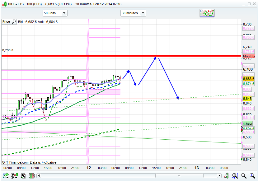 Good morning, well didn’t the FTSE have a stonking day yesterday in the end. Kept wishing I had held that long even longer! The resistances at 6650 even got broken while the FTSE marched higher and I thought we might see that 6730 in one day! Yellen delivered her first speech yesterday and basically its business as usual for the Fed then. She was pretty dovish so fiscal policy is likely to remain loose, with tapering still taking place as and when. News out of China last night that exports jumped is seen as good and maybe the drop last week on emerging market fears was overdone. Its almost as if yesterday’s rise was leading up to that data being good…..