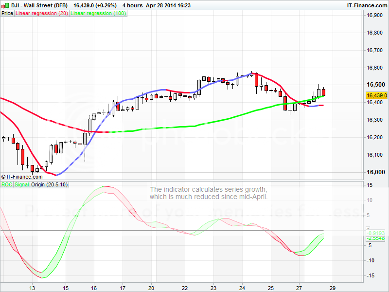 S&P 500 and Dow 4 hrs. — Growth has tailed off since mid-April. Right now both are recovering nicely from Friday’s dip and looking good, but momentum is weak. Major boost needed!