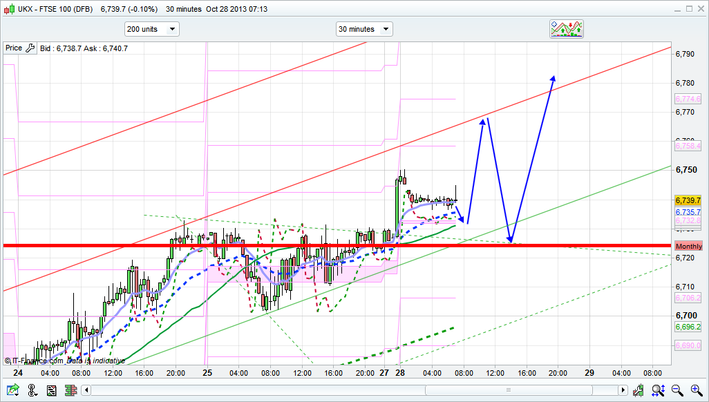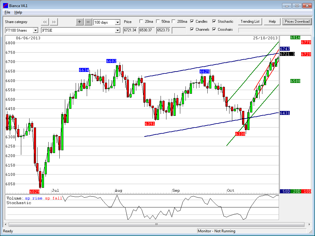 Good morning, well we have hit the 6750 overnight, after Fridays slow drift up. Once again its eyes on stimulus measures as Fridays consumer confidence figure was weaker than forecast – thus giving hope for extended QE. Not to blow my own trumpet but I have said since they first mentioned tapering that it wouldn’t be till 2014 at the earliest, and I still think that is the case. All the weekend news was dominated by “the great storm” and the likely travel chaos this morning. The US phone tapping story continues, and they won’t be happy that’s out in the public domain at all! Anyway, the 10 day Bianca channel continues to hold and with the bottom at 6720 and the top at 6778 its still pretty narrow, but dips to the channel bottom being bought is still the preferred play for the moment.