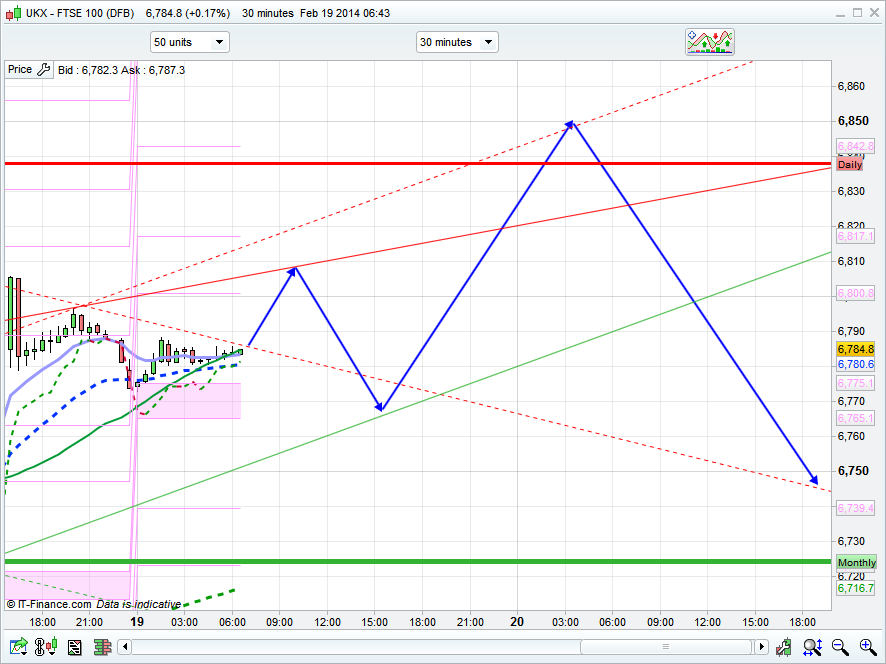 Good morning, worked out well yesterday though sods law prevailed and it just missed the long order level at 6715. Maybe just a little too exact there. Anyway, the short from 6755 worked out well and sure enough we got the rise and then a bit more at the end with the divi hunters to just stick the head over the 6800 parapet. It topped out just before the close at 6806, which was the Bianca 20 day channel top, that level has changed today to 6856 (10 day is 6849) so if it gets bullish again, 6850 looks a good shorting area.