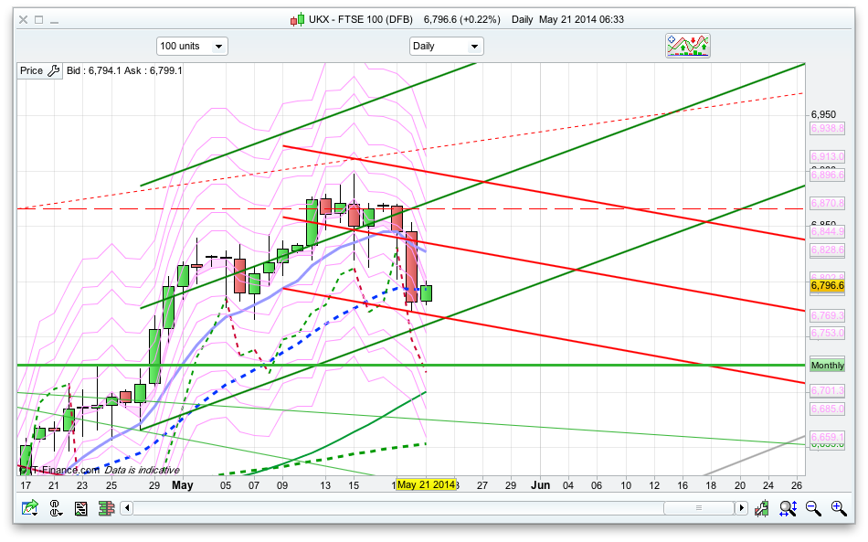 Given the fact that bears hadn’t really done much till yesterday I was once again a bit too optimistic and instead we ended up with a trending down day, with the supports being broken. The best strategy recently at the moment has been on the 10 minute chart using the SMA settings of 5 and 34 – members will know what this is. Overnight we have had a little pop back to 6800 as I write this, but the resistance levels today are 6808, the daily pivot at 6814 and then 6825. Not really that much upside based on them! Support wise while we are below 6800 is yesterday low at 6773, and then 6745.