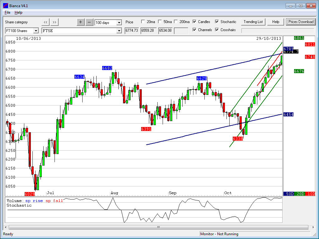 I personally think we will now see a drift lower over the next 3 weeks.The sharp rises of the previous 5 weeks are now capped but can’t see it too far below 6650 at present.
