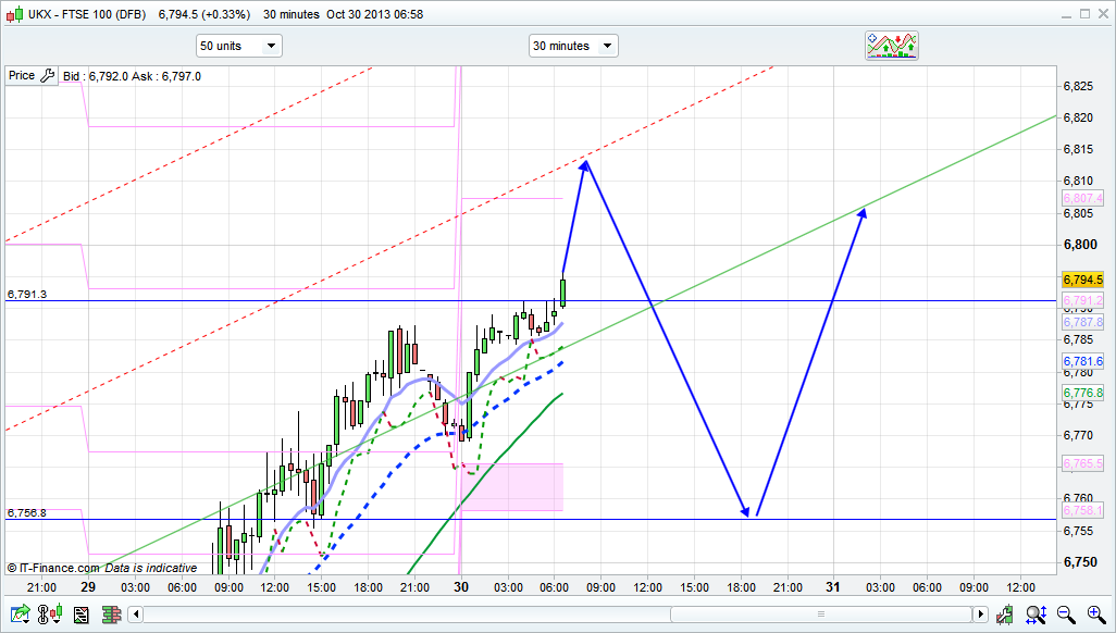 Good morning, well that was bullish all day yesterday, even breaking the 6775 support with relative ease. Unfortunately prices didn’t dip to the ideal buy area around 6700 but I know some of you held from that level on Monday. It will be all eyes on the Fed later as their 2 day meeting concludes, and its widely expected that tapering won’t be considered till next year, hence the bullishness this week. on the news front we have some German jobs data out just before 9am whilst in the US at 12:30 we have consumer price index data – which should move prices around a bit. The real fireworks will be at 6pm when the Fed release the outcome of their meeting on rates and tapering.