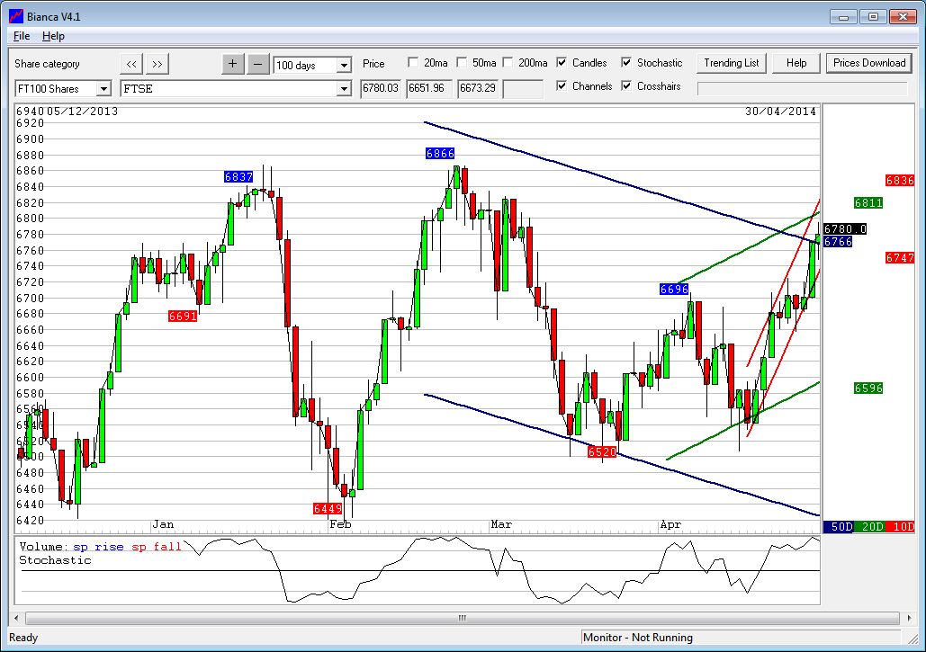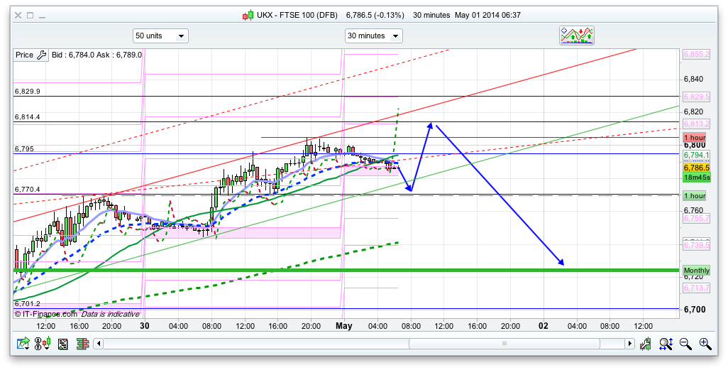 Good morning. Yet another trending day yesterday so my short off the resistance level didn’t work out, and we saw an out of hours high at 6805. Bit of a shame it didn’t dip quite to that 6737 area for the long entry, instead the pivot held and it was off like a scolded cat! Drives you mad sometimes! Bullish headlines with the Dow closing at new all time highs plus a couple of other little flags I’ll mention below set the alarm bells ringing for a change in sentiment before too long. In the meantime news out of the US (apart from a poor GDP) was pretty positive yesterday with a general vibe that the economy is gaining momentum (at least all that QE buys you something eh!). Next news not he horizon os job related over the next 2 days so will be interesting to see if that maintains the bullishness. I have a feeling that it might not.