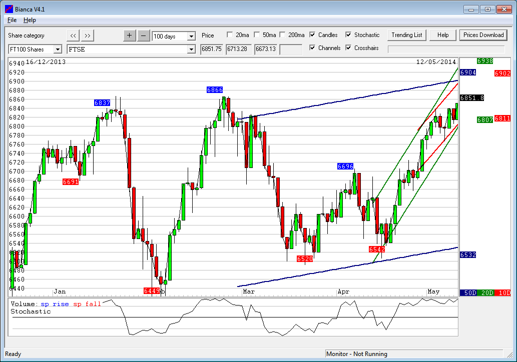 Well it certainly feels like the indices are all getting very excited and the party is going to end soon. More and more headlines about record highs and so on are usually a warning sign (look at when Apple hit $700, gold nearly got $2000, etc etc) – those levels made mainstream headlines and over the next few weeks/months generally halved! Anyway, the FTSE looks like it might well reach the 6900 area where we have R3 and also the 10 day Bianca channel – so a good area to look at shorts, but reaching that hinges on whether the bulls can keep the momentum going to break through this 6875 area.