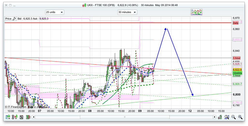We are pretty much on the pivot from live charts for today as I write this, being 6825. Yesterdays resistance was 6840, and that would likely cause bit of a stumble today if it reaches there again, with 6850 after that. There is a channel on the 10minute chart in play, the bottom of which is as this 6820 area, the top at 6837ish. I therefore expect an early bit of bull to the 6840 level. Going back to the 30 minute chart the next resistance is 6866 then we have the top of the Bianca channels in play, being around the 6900 area. If we start testing those levels we are not far off the all time highs at 6930. Imagine the headlines if we were to (a) break that level and (b) reach 7000. The media would be in a frenzy and trying to make everyone feel good about the economy. Shame its on just dodgy foundations having been pumped up with money and low interest rates. Anyway……