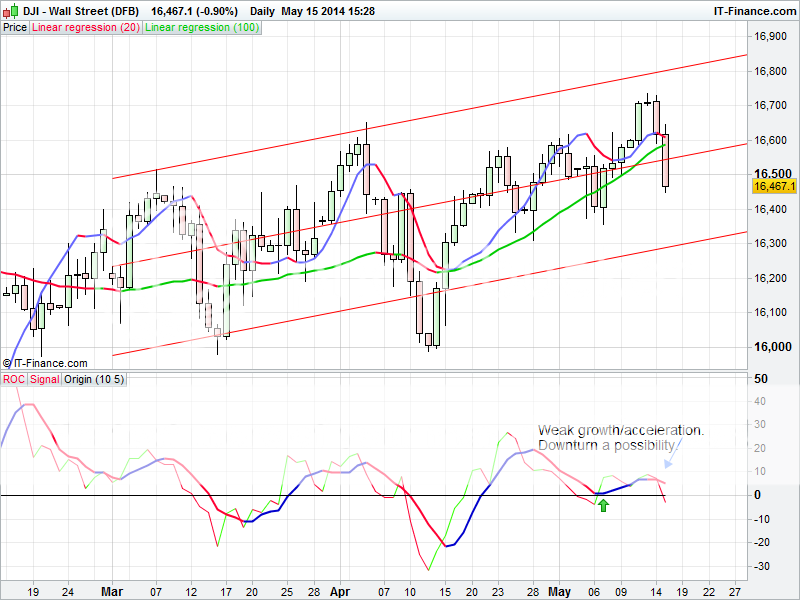 Thought I’d update yesterday’s shot of Dow daily. The comment stands; you can see that the growth situation has deteriorated in line with suspicions. I don’t think I really buy the idea that the FTSE will ‘outperform’ the US indices in 2014 — don’t see much evidence of independence!