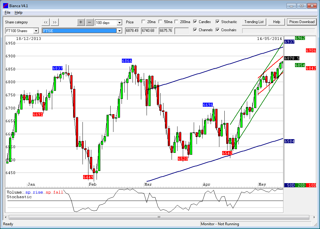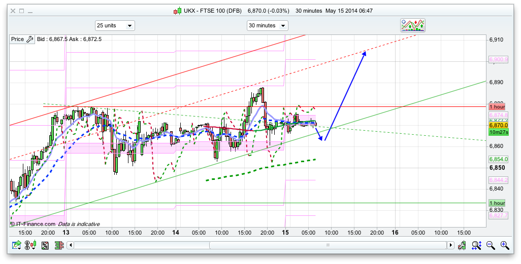 Only ended up with the 2 longs yesterdays as it didn’t reach the shorting level at 6892, let along 6905. I am still favouring shorts at these levels so will short with a bigger stake than a long for example, as looking at yesterdays action cross the pond the US bears are certainly starting to emerge. For the FTSE, support is is 6860 and 6850, as well as the Bianca 20 day channel bottom at 6854, so longs off this support area should be okay as I am thinking we will get one more leg up after that dip yesterday (based on the US markets). We have decent support, there is a pretty decent 30 minute channel in play, and the FTSE held up well despite the US lowing biggish yesterday, so there are certainly the foundations /reasons for it to go a little higher today. I don’t think we will just get one headline here in the UK about the FTSE being at a 14 year high and then it dips. While its up here i think it will at least want to test the all-time high, if for no other reason to generate some good publicity for the economy (cynic that I am!).