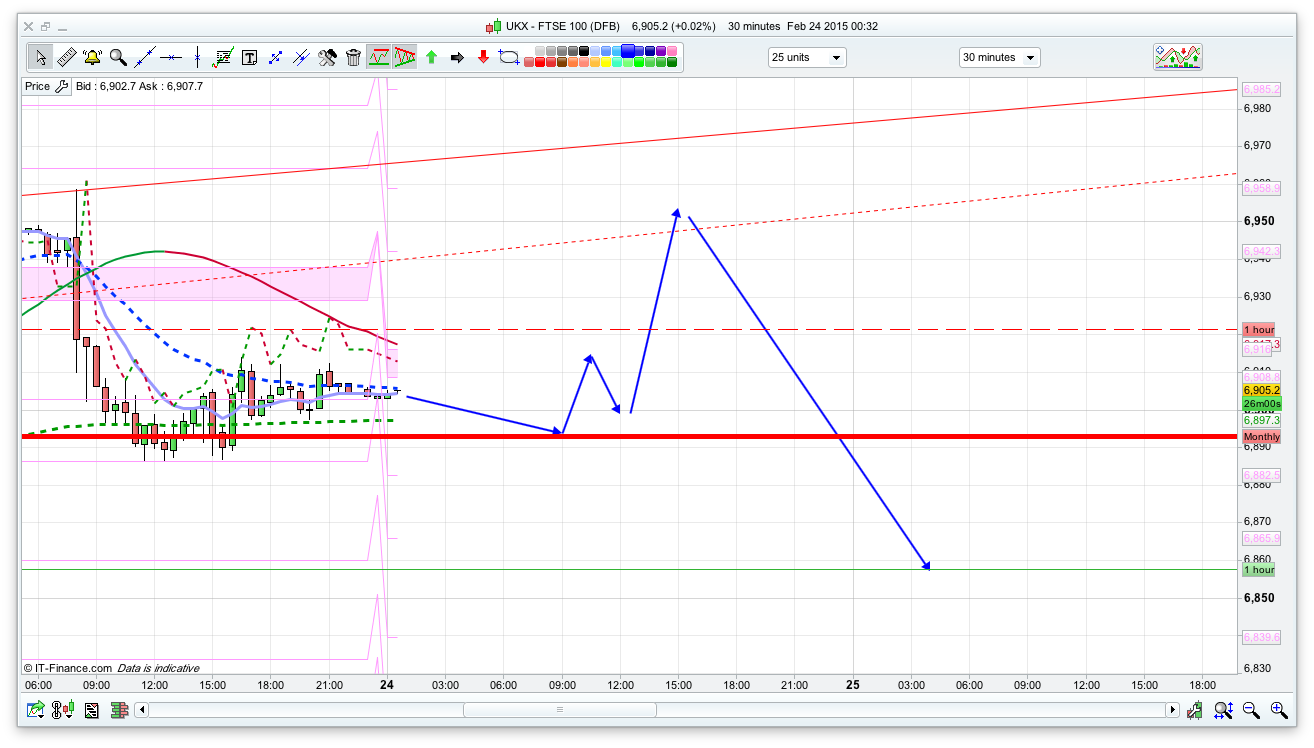 Just finished lunch after a couple of hours on the beach. Now for some serious business. Today’s call is FTSE around 6900 to 6915 before a decisive break down later. The Bears are waiting for some bad news to start the downward cycle and today there will be some bad news around. 6850 will hold for the time being, before 6750 by end of week. So ladies and gentlemen, the advice remains the same. Any rise in FTSE to be met with a short. Anyone advocating long is really trying to fool themselves and there are plenty of fools on here.