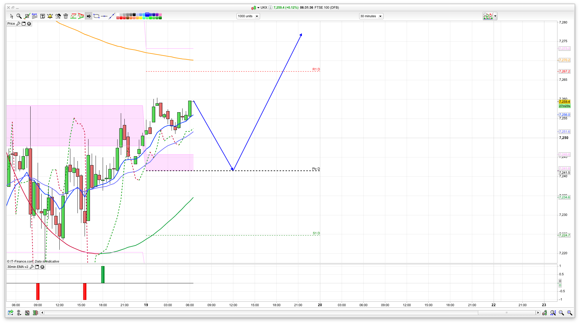 Good morning. That was a fairly slow session yesterday but the key thing was that the bulls defended the 7215 area, and we have had a small rise from it. They will need to break 7295 this morning if they are going to push higher, but if that support holds then we could well be on for a retest of the 7355 level, and maybe a move higher. Of course we have Donald Trumps inauguration tomorrow, so will be interesting to see how the markets react tomorrow and next week. Yesterdays data showed rises in inflation in the UK, US and Eurozone amid an upbeat speech from Janet Yellen about the economic recovery. Also helped the gold short which ran well from 1215 to target at 1206 (and a little bit further) yesterday evening.