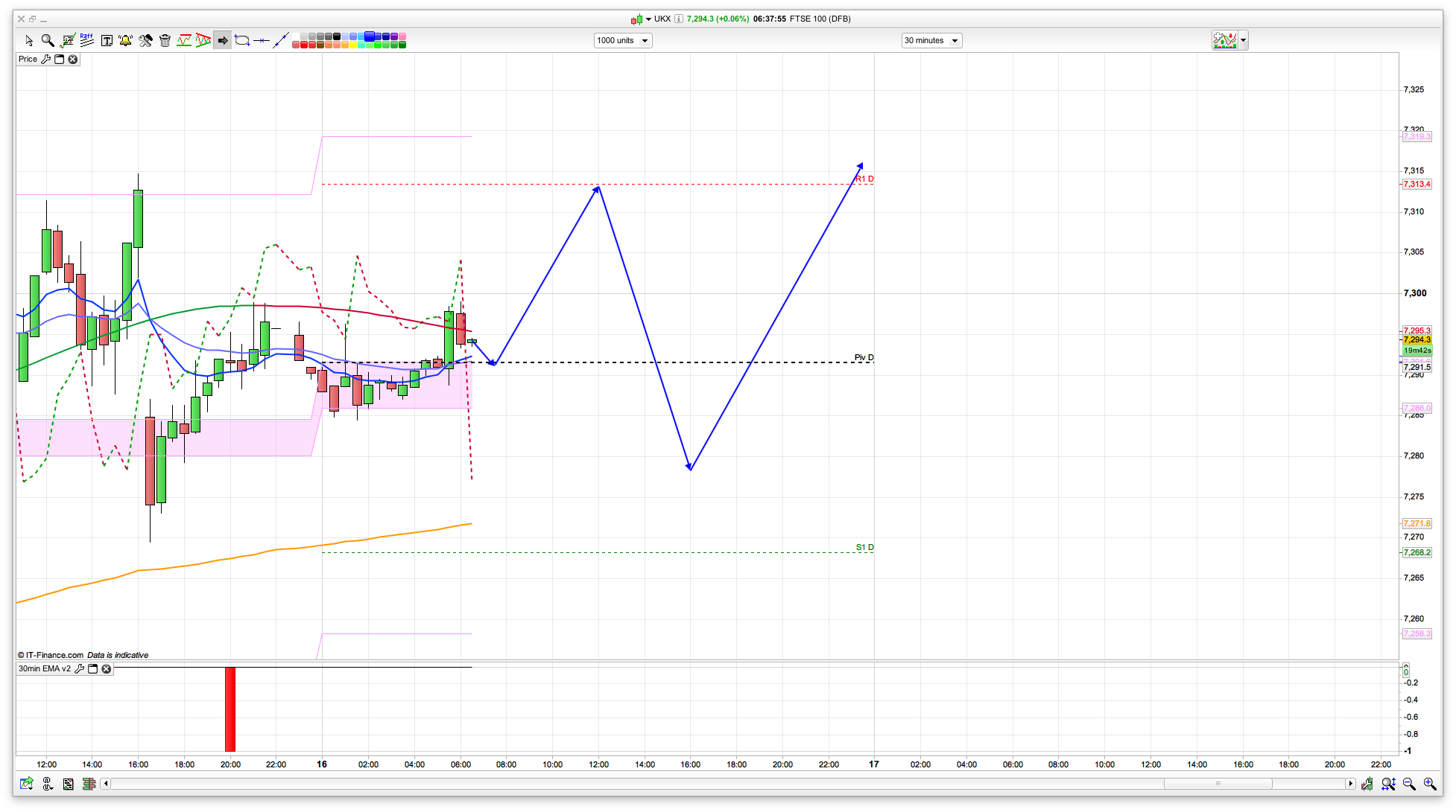 The key will be for the bulls to break 7313 – we might well get a double top reaction there first thing this morning and a drop back down, as its still a resistance level of note. It is also R1 for today.