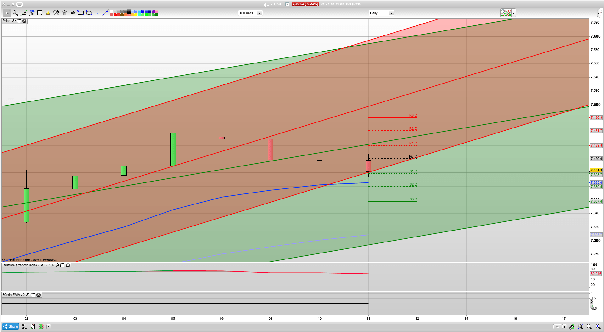 That said, I think we will see an initial rise at the open or just before as the bulls defend the 7400 level and the bottom of the 10 day Raff here. If so then a gap close to yesterdays closing price at 7421 looks possible, but we also have some resistance of note around here now. Namely, the 200ema at 7417 and then the daily pivot at 7420. As such if we do get an initial climb to this area we may then see the drop from here.