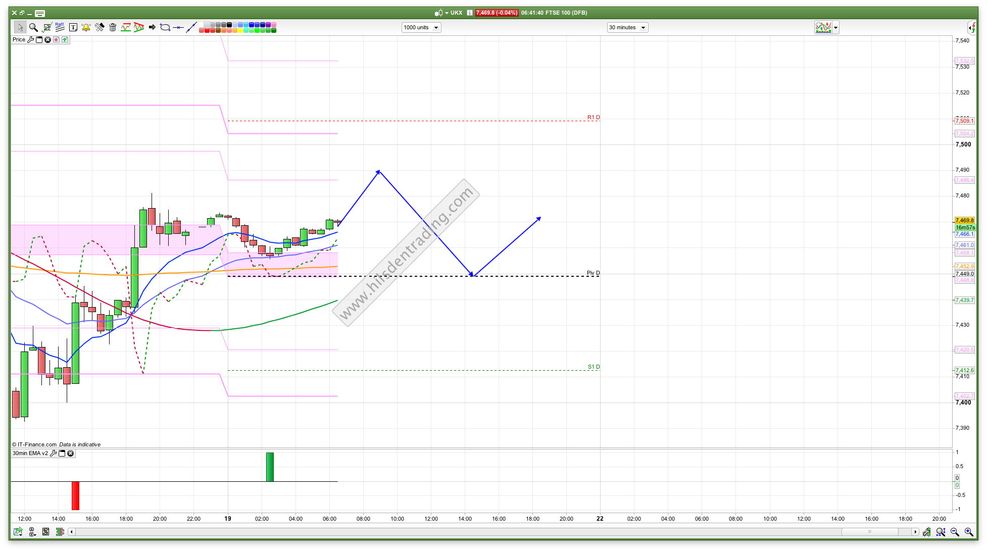 On the bearish side, if the bears were to break below the pivot at 7450 then a revisit to 7400 looks likely, with a brief pause at 7439 where we have the 30min coral (now green and showing the trend is up on this shorter time frame. The trend on 2 hour and above is bearish still).