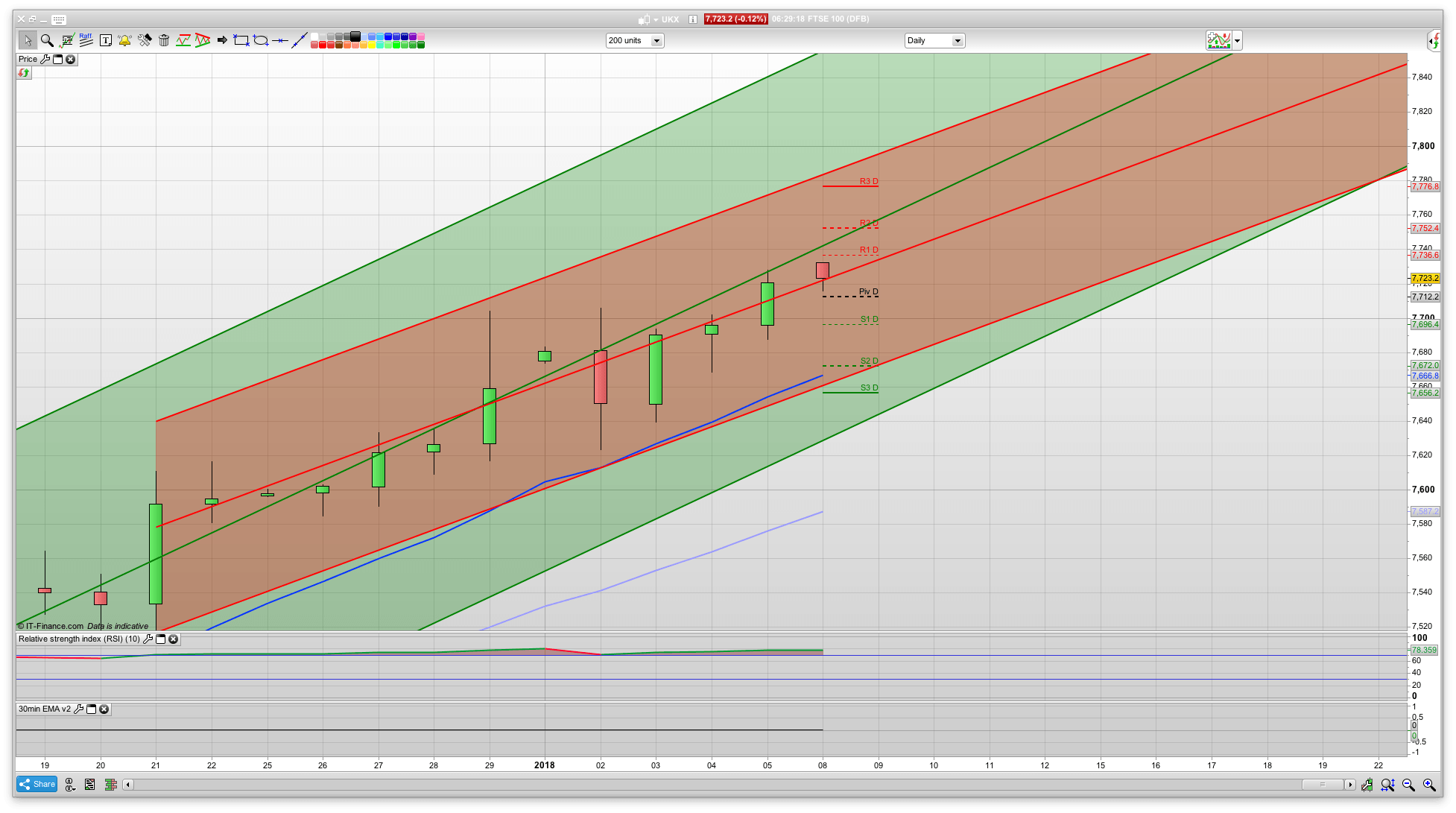 If the bears were to break 7685 where we have the 200ema on the 30min chart then we may well get a bit more of a pull back to the 25ema support area on the daily chart which is at 7587 currently. Both the Dax and the S&P are still nudging the top of their respective Raff channels, but as the FTSE has lagged their bullishness over the past few weeks, we are only around the mid point of ours. So we are either lagging them and will follow them down if they drop back or they stall a bit here and we rise further towards 7800 to catch up. The Dow has managed to surpass the 25,000 level pretty easily and pull away from it. Basically its all bullish at the moment! Which logic says is the time to be fearful, however, that argument has been trampled over the past 12 months…….