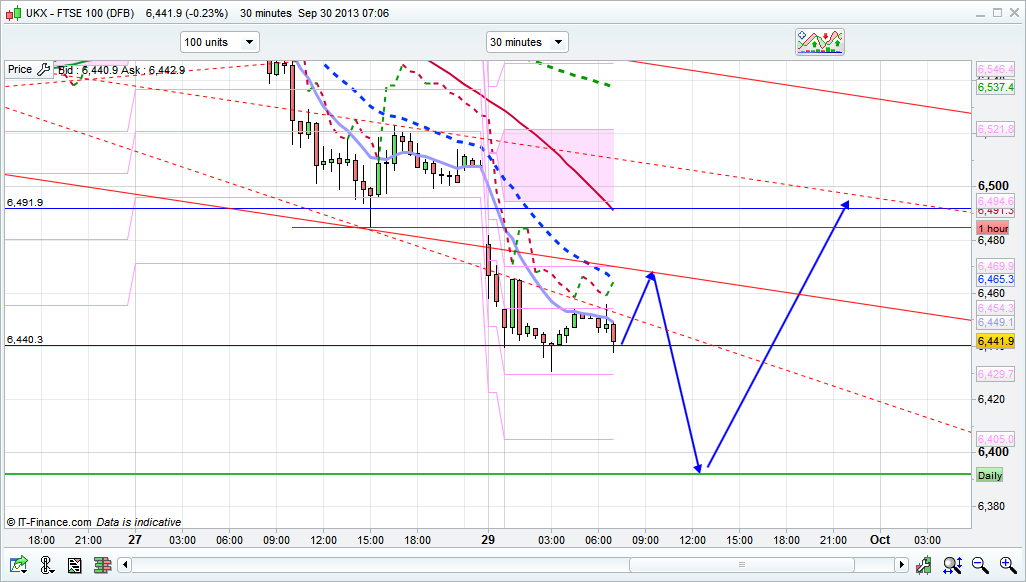 Looking at the S&P to start with I have 1680 and 1671 as supports, coupled with the Dax support mentioned above at 8530 I think we will dip a bit further across the board but then possibly have a bounce, on the FTSE probably from the 6405 area where we have the 200ema on the daily chart and Fib 4 on the 30minute (pink line). Initially I have put in a climb as I think the initial supports will hold but then break later in the day, but I think we can say that 6404 will be seen today as markets will be spooked by the US situation. Again. Its certainly going to be choppy today anyway, even more so this afternoon when the US comes online. I have also got Dow support at 15110 which is looking likely to get hit!