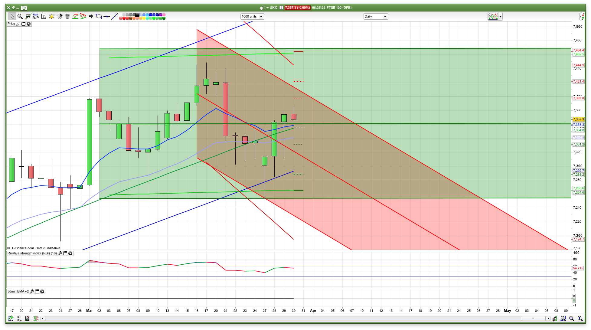 Support wise today I am watching the X area, and also down to X, and if we do get a dip then this area could well see a bounce. We also have the daily pivot at 7354. We havent yet tested the 2 hour coral line, which has support slightly lower at X.