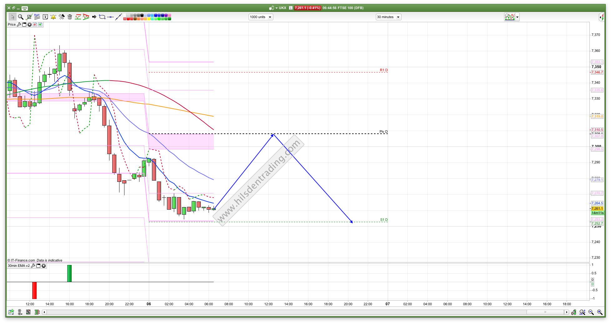 I have some fairly weighty looking resistance at 7310 this morning on both the 30min and 2 hour charts so feel that this is worth a short if we do get an initial rise. The daily chart has also flagged up a short for the first time in a while, with resistance at 7328 and this area could well see a turn down lower. I also have resistance at 7353 but I don’t think it will rise there today.