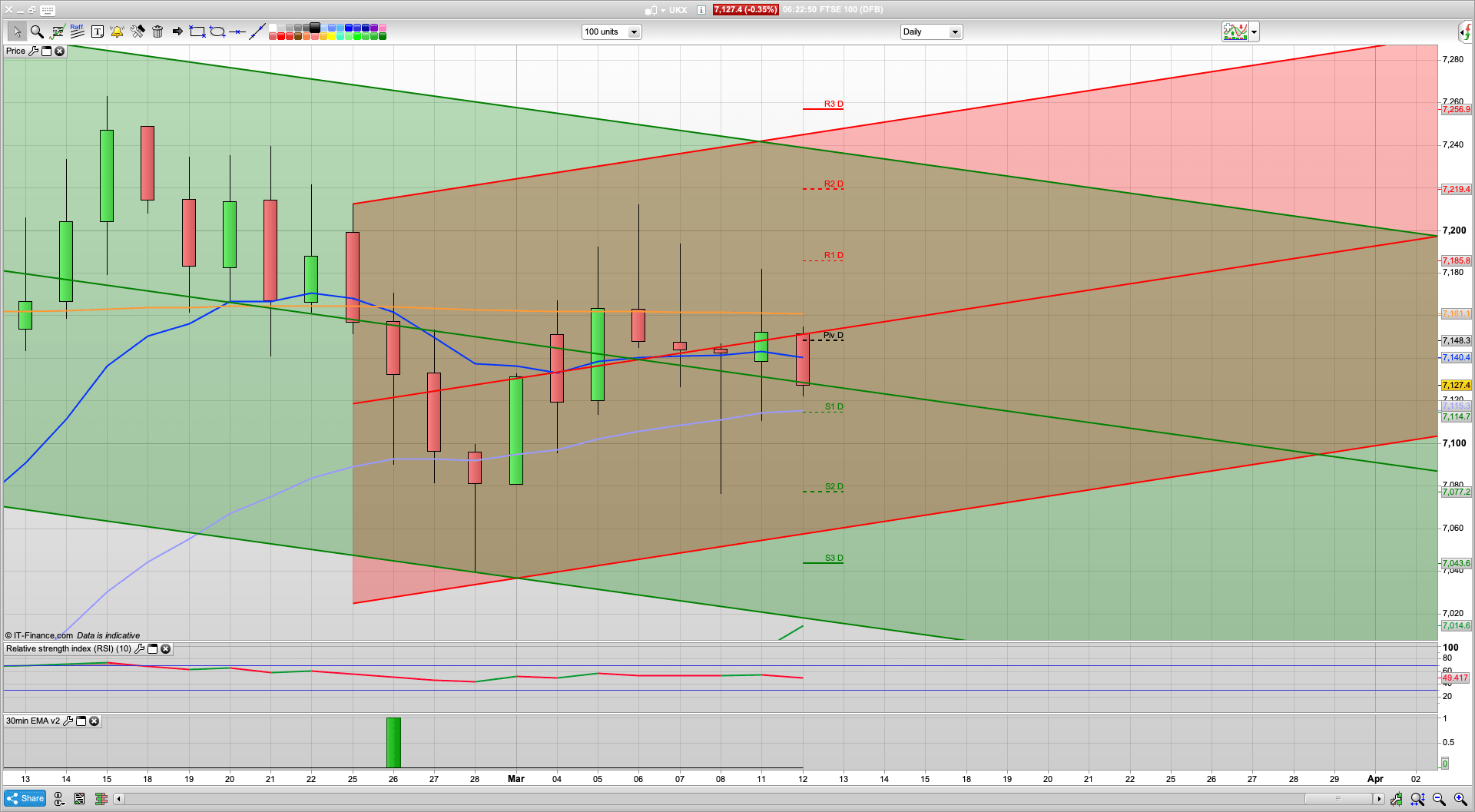 I have plotted a slightly bearish day with the arrows today as we might well be a bit jittery and the pound will weigh on the FTSE. I have gone for an initial short off the pivot area at 7150 for a run down towards the 7104 and 7068 resistance areas. If we see this lower level then I am expecting to see a bounce here. We bounced just above this on Friday and also just missed the 7111 long yesterday so there is still some buying pressure around. The daily chart remains bullish for the moment, with the bulls defending spikes below the 25ema, which is at 7115 for today.