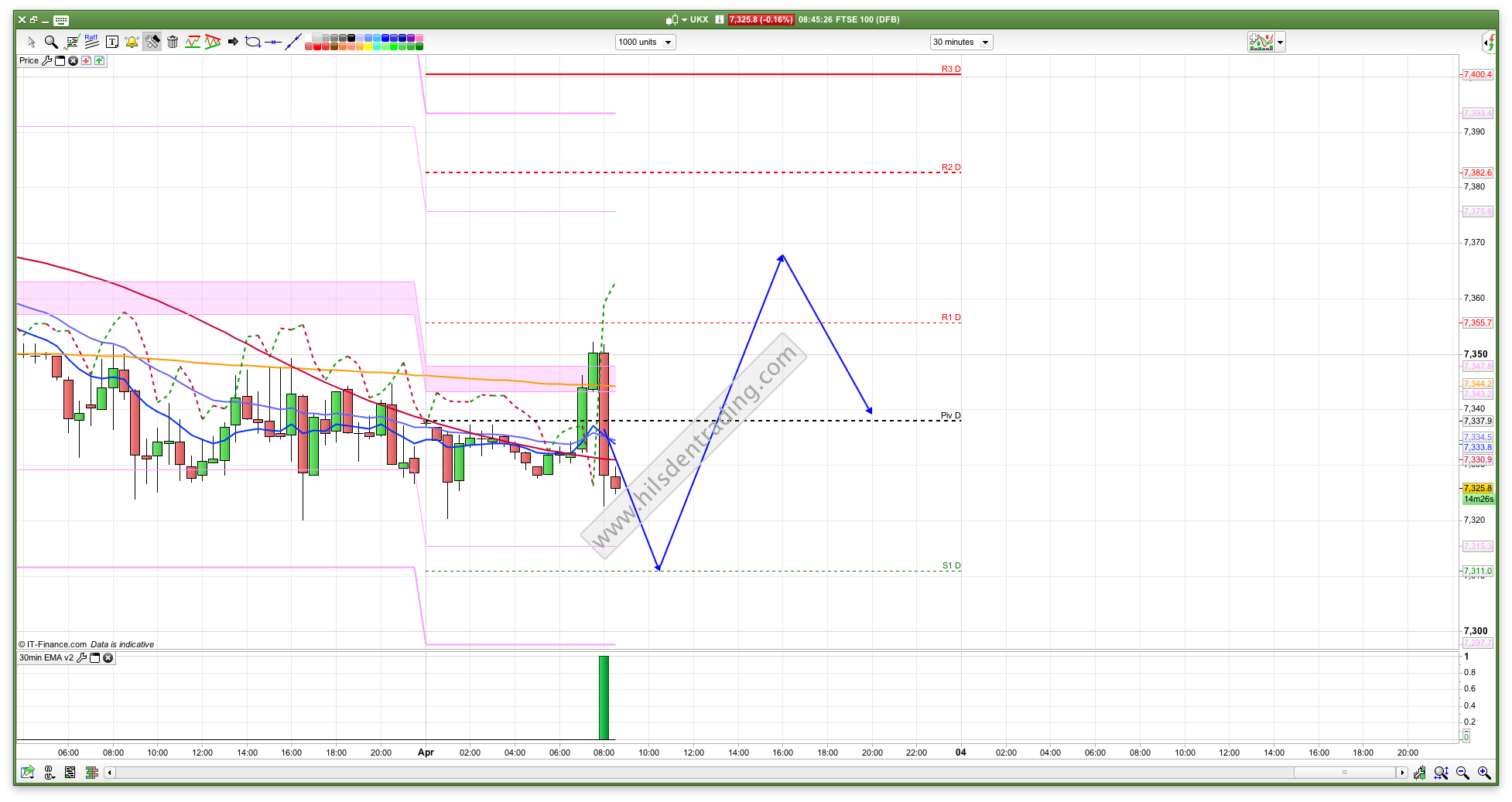 The 2 hour chart is bearish at the monent with resistance from the Hull moving average at 7361, so we may see some stutters here if we are going to rise back up towards 7400. I have gone for an initial dip this morning, mainly as the 30min chart has a bit of a bearish look about it. The ASX200 also experienced a bit of a dip and rise day.