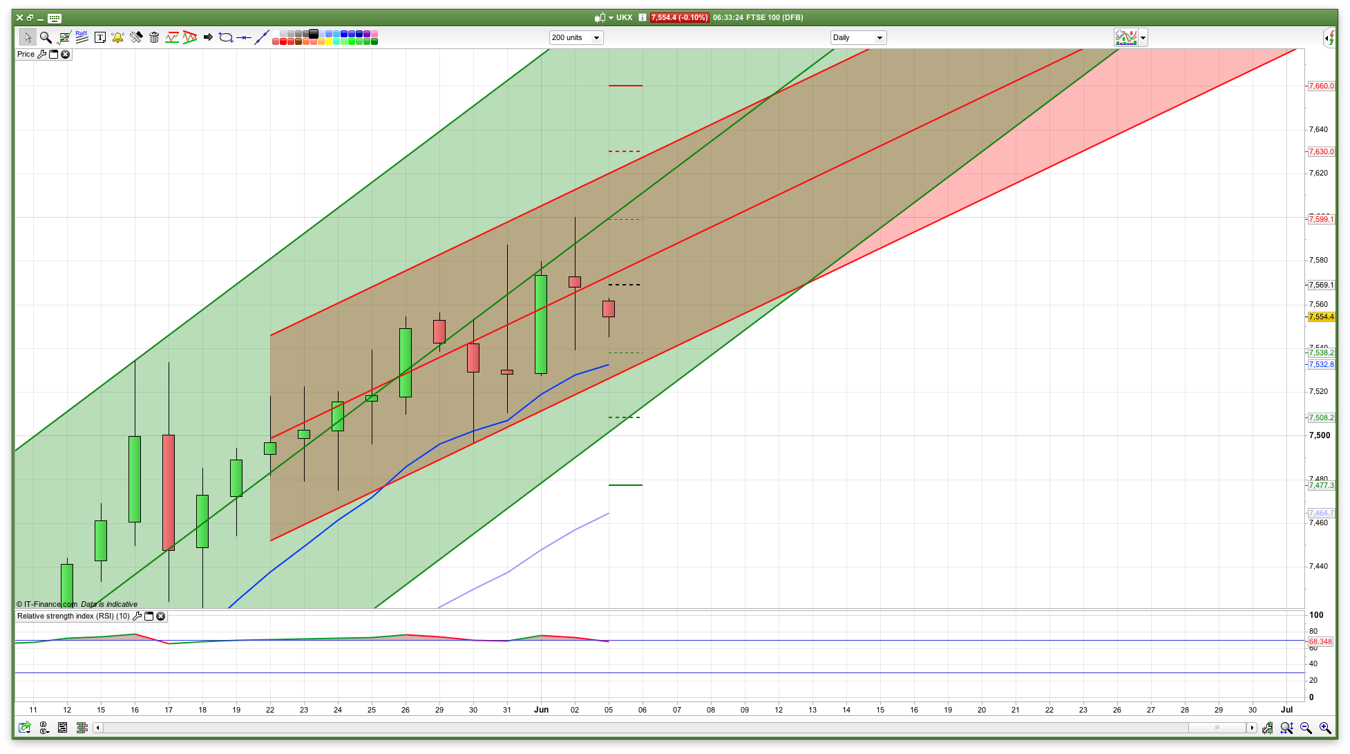 At 7525 we are at the bottom of the 10 day Raff channel, and have had a slow pullback this morning. Lower support is at 7510 so we may well see some support around the 7500 to 7525 level for a rise back to test the recent high at 7600. Above that then 7685 looks possible, but with the General Election on Thursday it will be some brave bulls to take us that high this week. That said, we could be on for some buy the rumour, sell the news and Friday sees the worm turn for a trip down to 7200 again.