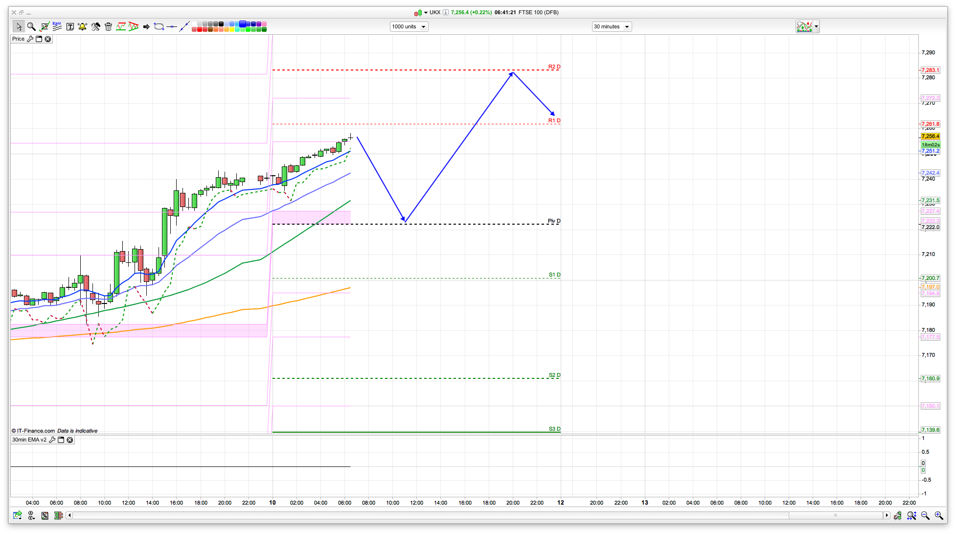 Good morning. The bulls came out fighting yesterday, rising from just above the 7177 support level that I had (it hit 7182 then bounced) and managed to hold above the 7200 level. There was a bit of a stutter at the previous high at 7225 however during the evening, helped by the US and Trumps tax cut talk, the FTSE managed the 7250 level. Overnight has seen further strength so we might well be on for the next level of interest which is 7269 and the top of the 10 day Bianca. But its a Friday so could go anywhere!!