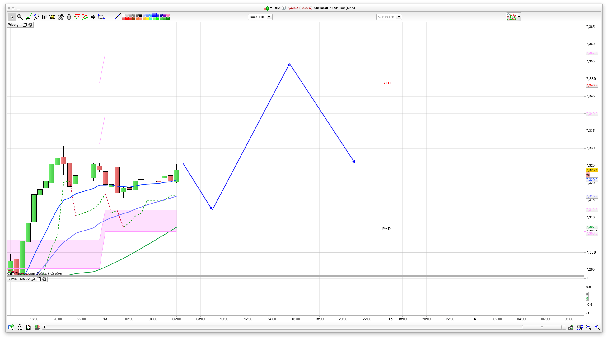 For today I am thinking that the bulls will break through the 7330 resistance area to test that 7355 area of resistance that is next on the cards. I expect that we may see some bears appear here though so probably worth a short here. There is support on the 2 hour chart at 7316 now, so if we get an initial dip then we might test this area, and the pivot slightly below at 7306. There is also a green 30min coral support line at this level.