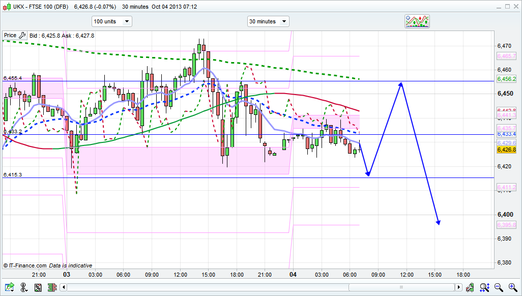 Morning all. I am back in the land of the living today and thanks for the emails. Shame to miss yesterday as the short from the 6474 area looked like a stunning call in the end good for a 50 point drop pretty much. Glad to hear some of you got on it though but apologies I wasn’t able to SMS that one. The US situation is still at a log jam, though interrupted briefly by a woman in a car ramming a Congress security barrier – got the bears excited for a brief spell but soon recovered as news broke. Bit weird as she had a 1 year old in the back so must have just flipped out. While the US impasse continues I expect it will still be bearish, and it fuels worries that they might not raise the debt ceiling in time for the 17th October, which if they don’t will mean a default on US debt, which is unprecedented and won’t be good. The IMF have urged them to sort it out and stop their political infighting. Christine Lagarde said, “The government shutdown is bad enough, but failure to raise the debt ceiling would be far worse, and could very seriously damage not only the US economy, but the entire global economy,” she said. “So it is ‘mission-critical’ that this be resolved as soon as possible.” Maybe they are going to bundle a solution to both into 1 and we will then get a rally, maybe after the S&P hits 1660/1665. Dow hasn’t been in a rush to regain 15000 either. Either way, failure to resolve either and both these issues is not good and will jeopardise the tentative “recovery” that we all keep hearing about – will they risk that? I doubt it. But as per usual its just politician’s playing to get as much as they can for them and their side as the real issue drags on. Ideally someone would just bash their heads together and we can all move on!