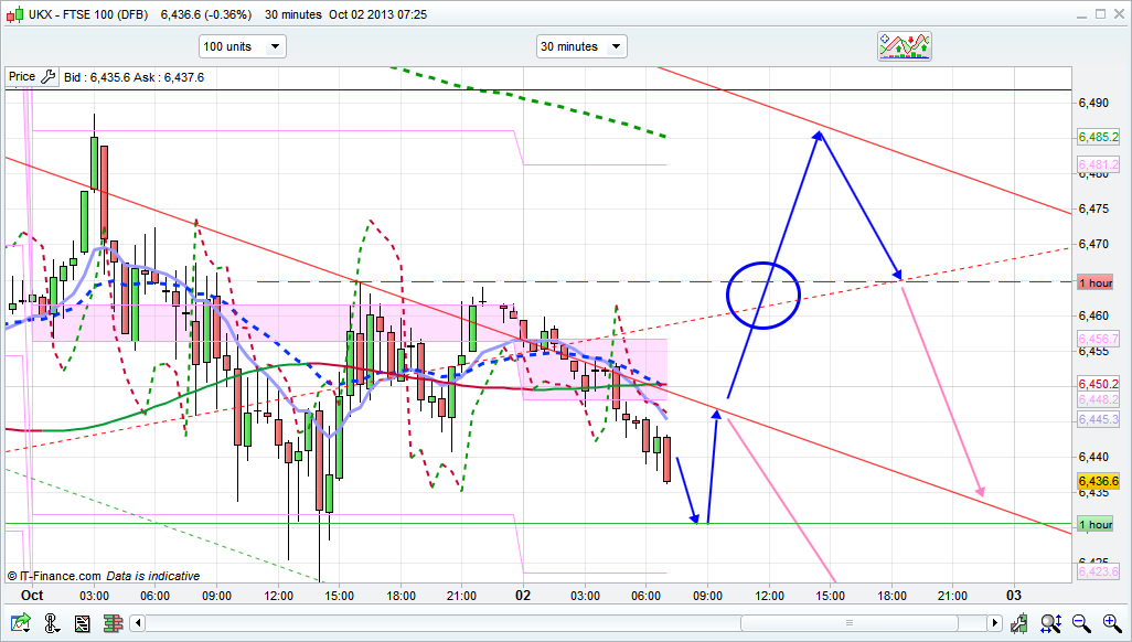 Good morning. Almost followed the script yesterday but a little annoying that it just missed the optimum shorting level at 6471 before dropping. We got the little bounce and then more downside, but 6430ish has held twice as support now. Markets didn’t seem that fussed in the end with regards to the actual government shut down in the US, compared to the drop we saw when they were still negotiating. Looking at the charts and the failure of the S&P to get back above 1701 suggests still more bearishness to come (S&P hit 1698 and then fell back yesterday). The main issue that’s looming is of course the debt ceiling and the worry will be that the negotiations on 17th October will also end in deadlock, and that’s more worrying than a one day government shut down. We have been here before with debt ceiling talks and at the last minute agreement was reached. I expect it will similarly go down to the wire this time. If no agreement is reached then the US will be at risk of defaulting which will rattle markets quite a bit I would expect.