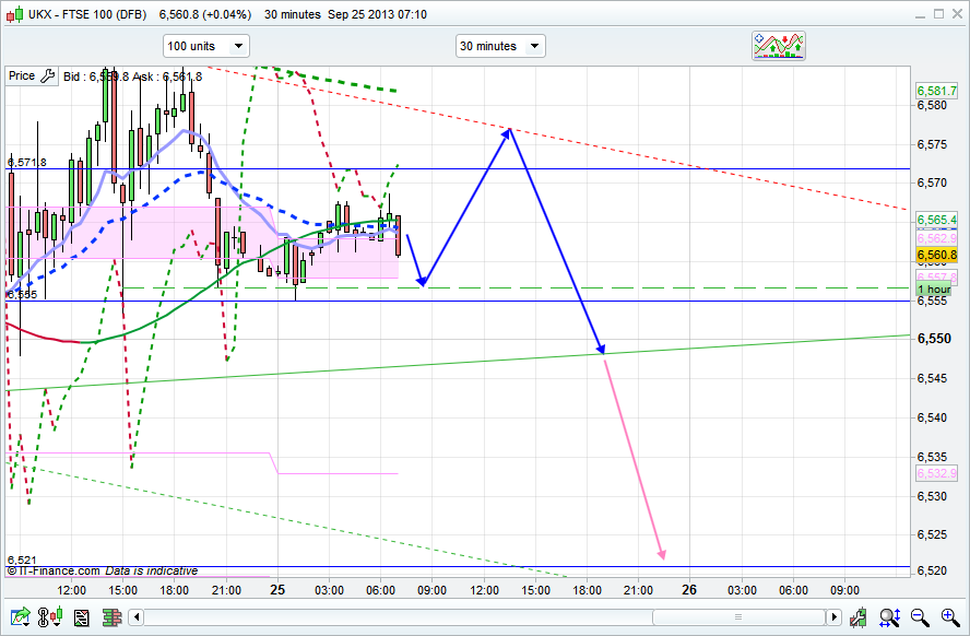 Good morning. Nice bounce yesterday off the 6550 level however the bulls failed to gain any ground above the 6585 area and as expected had a long hard slog to get that rise. Still, it played out as planned and hopefully you picked up some points too. With it being such hard work for the bulls yesterday, and despite the strong bounce on the S&P I think its probably best to have a slightly bearish bias now. We are still nudging the bottom of the daily Bianca channels, whilst the 10 day Raff is firmly pointing down. Short the rallies today I think! US consumer confidence came in worse than expected yesterday to a 4 month low, maybe the start of the good news about how well the various economies are doing starting to wane. News seems to go in cycles whereby you have a run of good, then a run of bad and so on.
