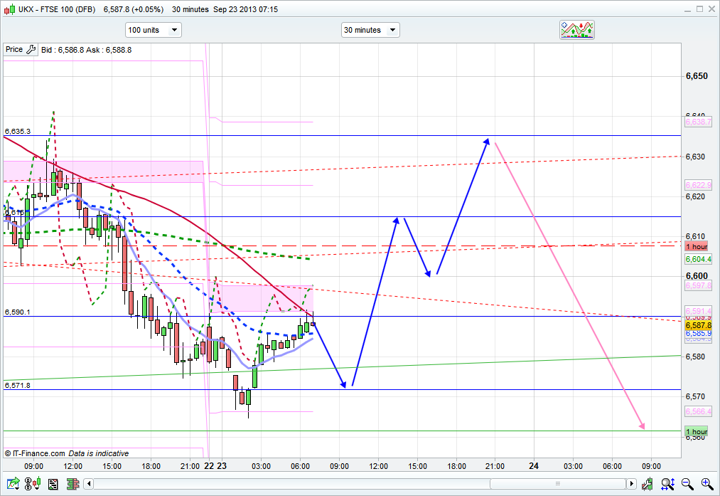 Good morning. As expected Merkel won a third term in the German elections so the Dax should remain pretty stable. The main news for the UK over the weekend seemed to be a very upbeat media about the UK economy and how well its currently doing, at the same time talking about the “housing bubble” that is brewing. The FTSE is still hovering around the 6600 area and looking a little bit more positive after the drop on Friday. Unfortunately Friday wasn’t quite as bullish as I expected, running out of steam not far above where I closed that long – stalling at 6635. Knew I should have gone short when I closed it at 6623! The second long on Friday at 6592 didn’t amount to anything at all such is the joys of Friday trading.