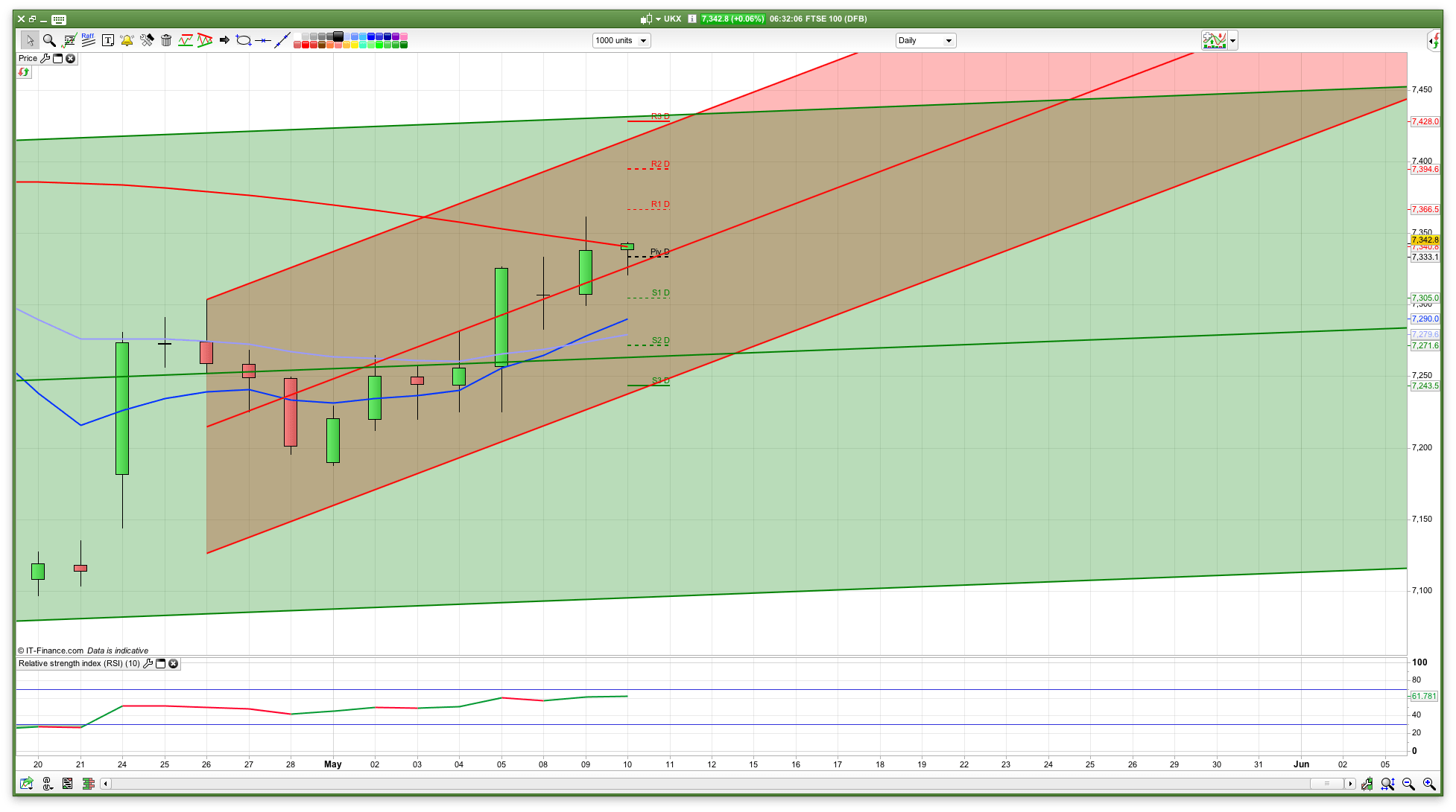 The FTSE 100 was surprisingly bullish yesterday, rising to the top of the 10 day Raff channel at 7359 before dropping back from there. Overnight it tested the 7320 level but has climbed back again to the 7340 level. The S&P short we had at 2399 didn’t really do much till the end of the US session and now looks like its struggling to hold above the 2400 level. The drop was due to Donald Trump firing FBI director James Comey after he misled Senate over Hillary Clinton emails. Rumours of a cover up too…. The Vix also ticked up a fraction yesterday, having been making record lows. The Dax short worked well, though probably should have flipped to a long at the 12710 level when we closed! Isn’t hindsight a wonderful thing!