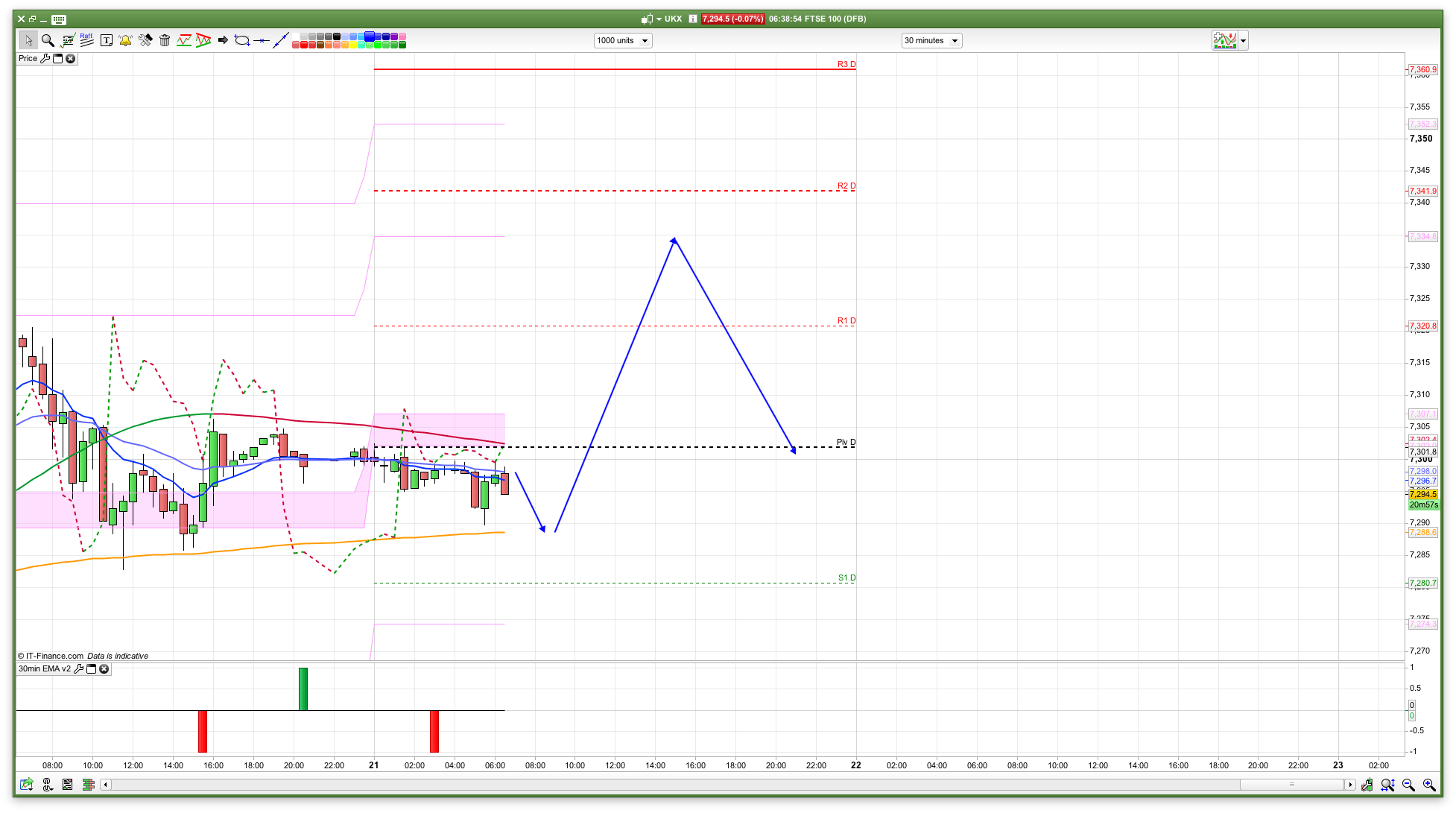 Good morning. As expected it was pretty flat on the FTSE 100 yesterday with the US closed for Presidents Day, however it was slightly bearish dropping off from the 7320 level to a low of 7383 before hovering around 7290 for most of the day. Managed a few points from our long though so that was good. Gold stayed around the 1238 area but has dropped off overnight, have just closed the short at 1234.