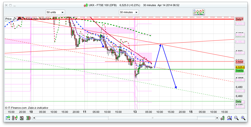 I am still pointing down but no position – should have shorted the rise to 6572 earlier but always nervous opening within an hour of the US open. Am not strongly down so would only take 1/3 of my position maximum at the moment – just when you think it is trending one way it strongly reverses!