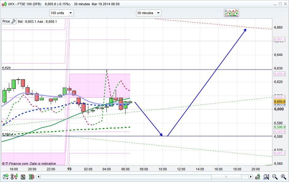 Good morning. Well we got the dip and rise yesterday as expected, though the bears tried to breach the 6550 level, hitting S1 at 6533 instead, before the bulls came charging back. They managed the upper resistance at 6620 before running out of steam, but a lot of the rise was thanks to Putin saying that he wasn’t going to risk a military conflict with the West. Its a fairly big today with Yellen and the Fed takingcentre stage, and the associated taper announcement. They are in the tricky position of continue to taper and thus sending the message that the financial system is in rude heath, but data suggests otherwise; or no taper again and they think its not quite so robust! In the UK we also have our budget today, the theme of which I expect will be pro business, recovery going well, and plans on track but not out of the woods yet. Along those lines anyway!