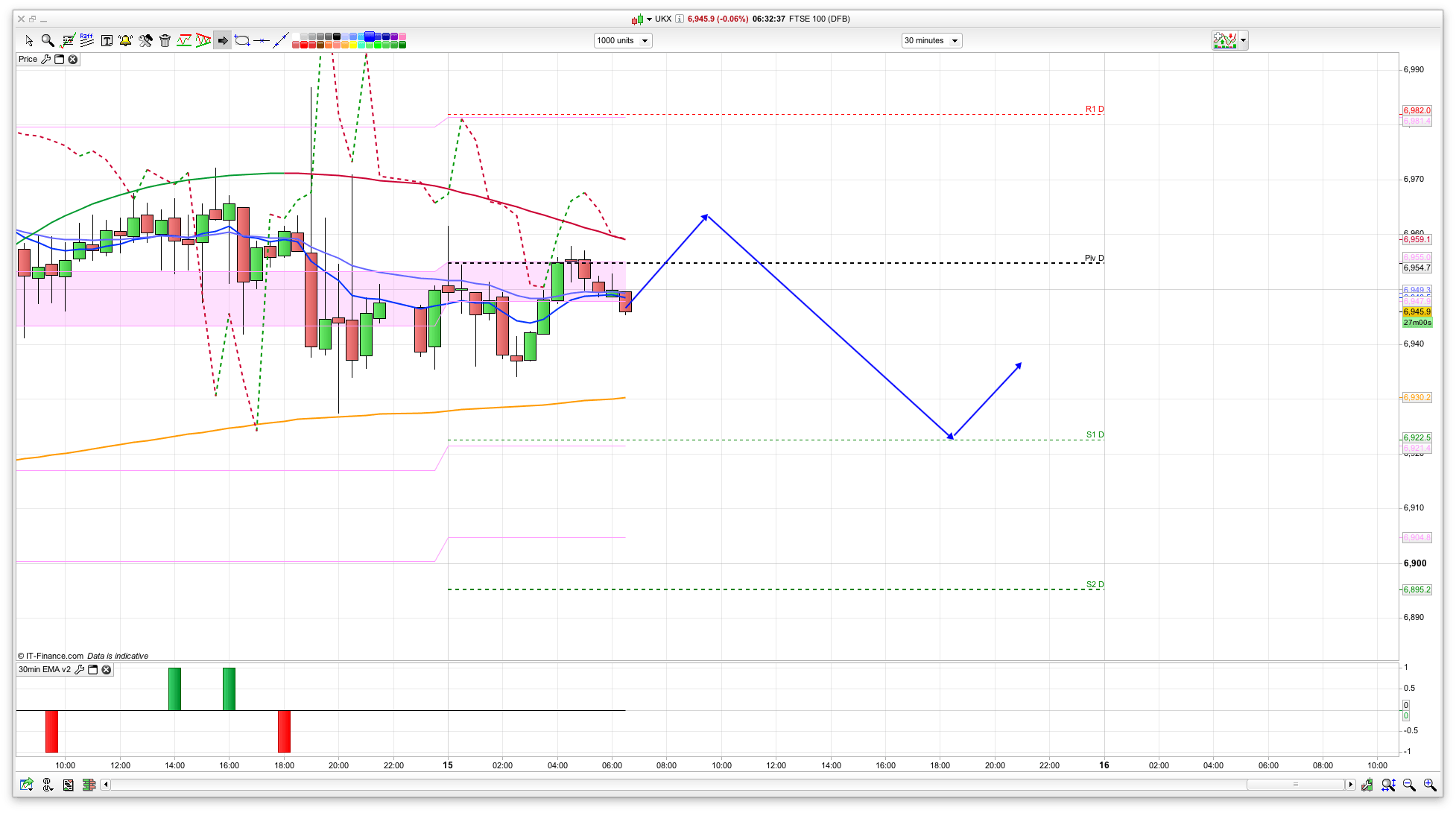 If the bulls were to break through 6965 then 7000 looks pretty likely with 7030 and 7100 above that. I have gone for a small initial rise today as the 10min chart is bullish to start with, showing support at the 6944 area, but pre market short times frames are not the most reliable. The ASX200 (Australia) had a slow drift down for most of their Thursday session. As such I am favouring the shorts for today, with 6960/6964 a decent looking short entry level.