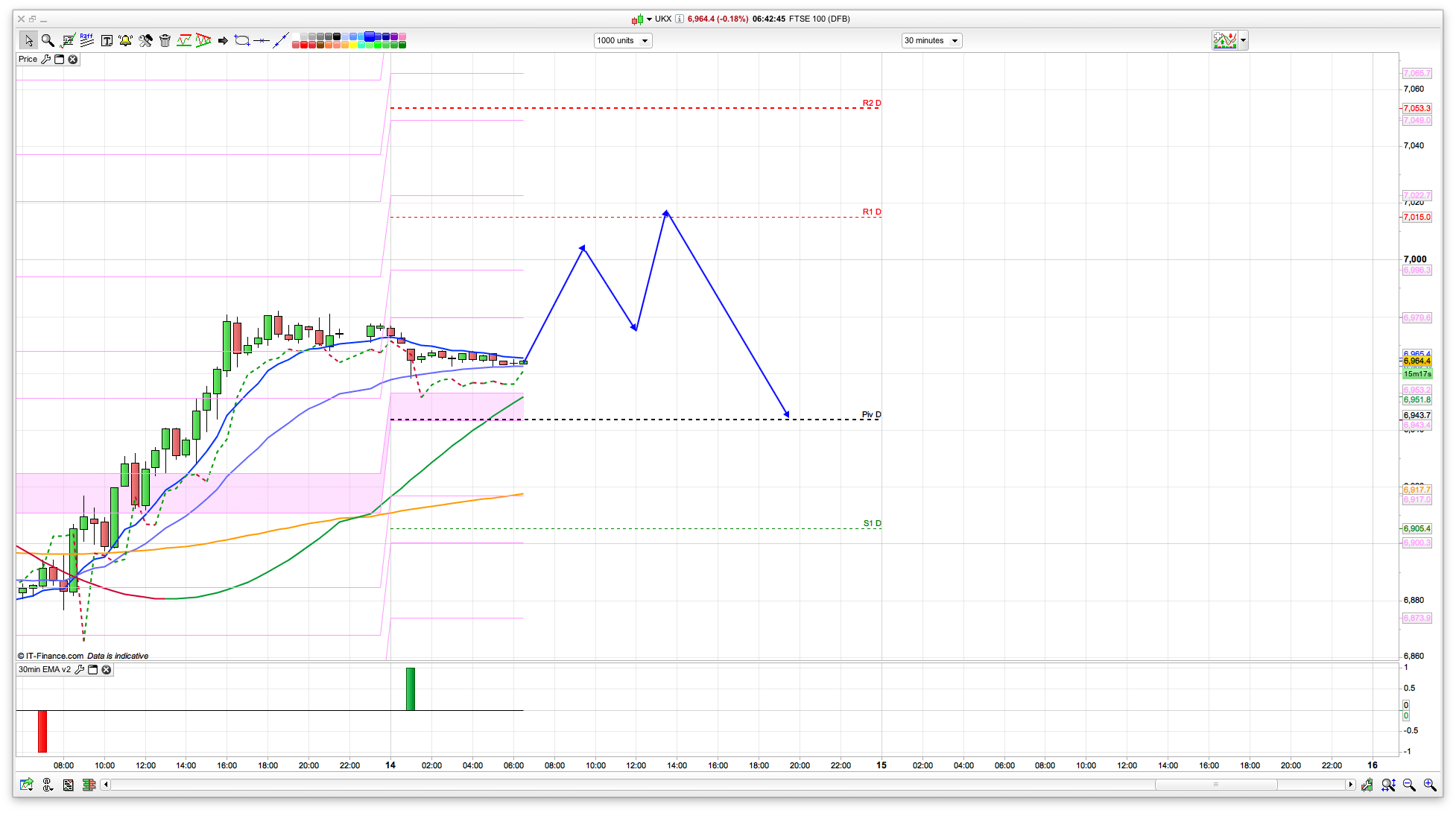 With a fairly static overnight session, the 10 min chart has gone bearish with resistance at 6972, though we may well see the bulls take charge again initially, today as the 30min chart has support at 6955. The resistance level at 6975 wasn’t particularly strong yesterday, netting a few points only, but the bulls have managed to make the 2 hour chart bullish again, with support at 6868. So whilst its not overly clear I am thinking an initial rise to 7005 and possibly 7015 before a dip back, probably on or after the news later (19:00 the rate news comes out), though it wont be a big surprise if rates increase by 0.25%. What might well move the market more is the Fed Summary of Economic Projections also released at 7pm.