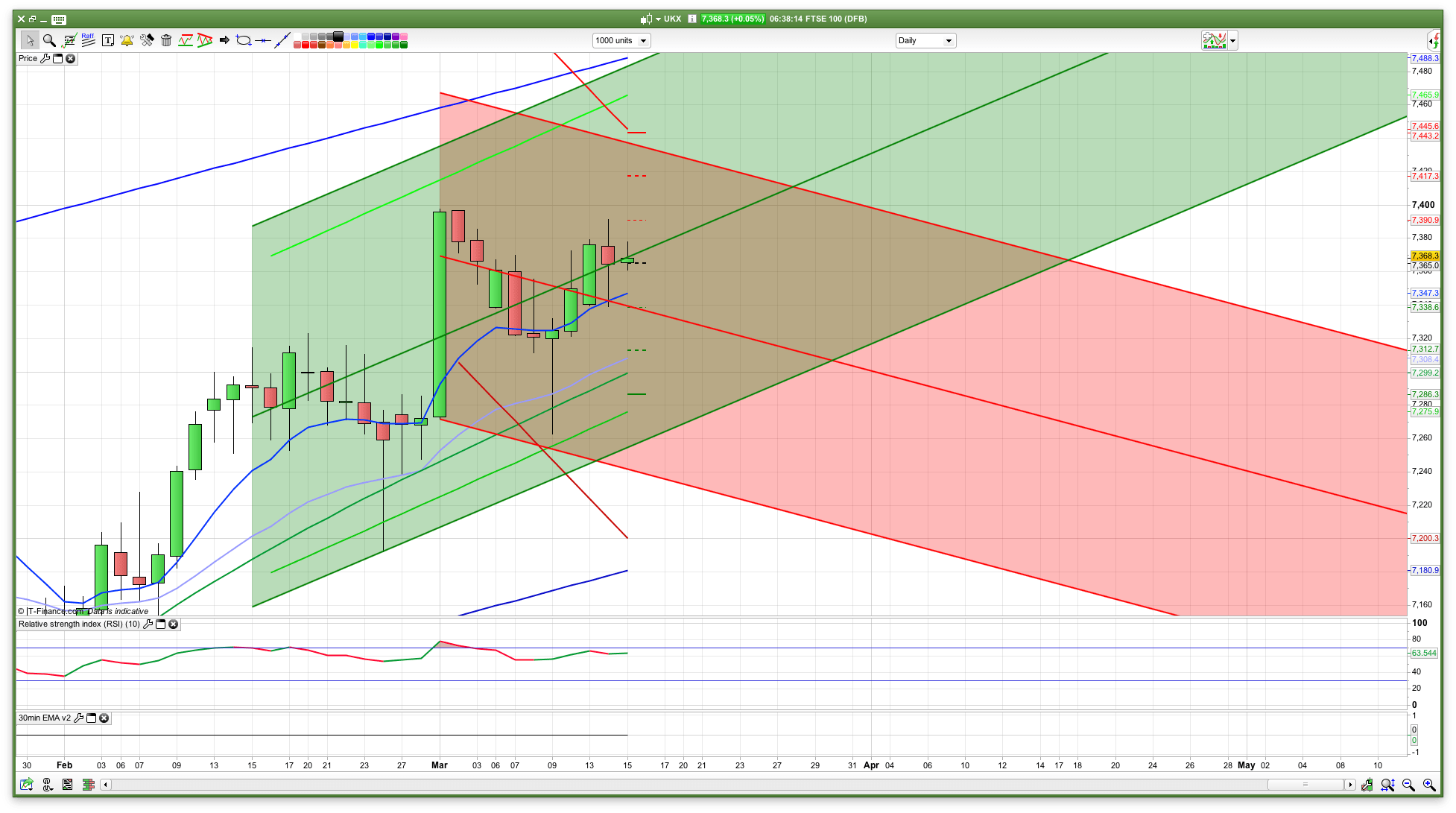 Assuming we do have a little drop first thing, then we have support at XXXX. Interesting yesterday high at 7390 tallies with R1 also. So, this XXXX might well hold initially – bit off a double bottom area as well, though if it breaks then a slide down to XXXX looks possible. But, with the Fed news and a 9.6 point dividend later I don’t think it will be overly bearish. In fact. if we follow the ASX200 we have a fairly strong performance from that today.