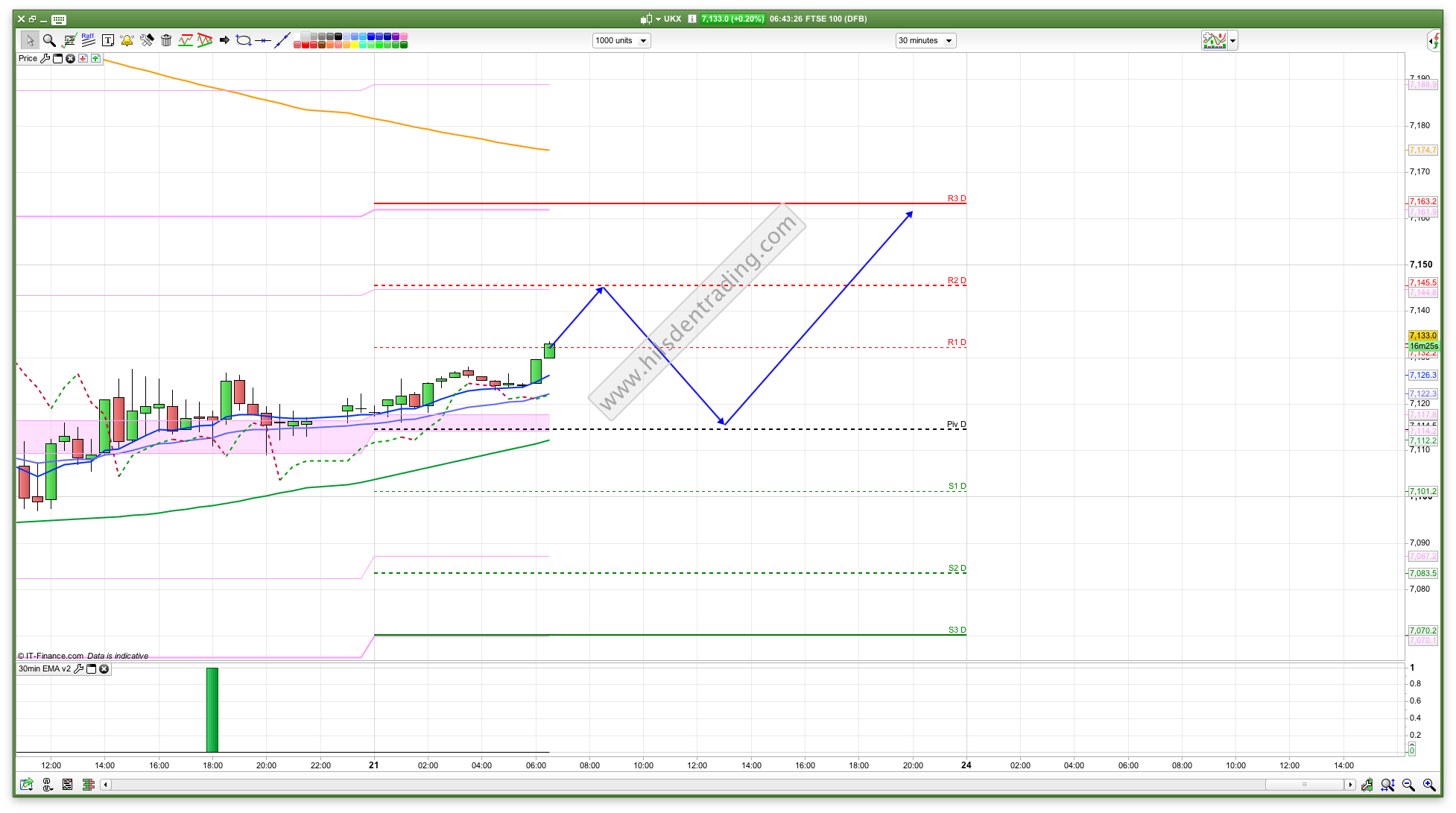 Bit of a tricky one to call today ahead of the French elections. There are 3 main levels that I am looking at that might be worth trading off and that is support at the pivot and 30min coral area at 7112 – we might see a bounce from this level and a bit of short covering today. And then for resistance, we have a few levels of note, namely 7141 initially, then 7175 above that. I think this latter might be worth a short but as its option expiry Friday ahead of the French election it might be worth giving it all a miss or just doing small stakes (unless you fancy a gamble of course!).
